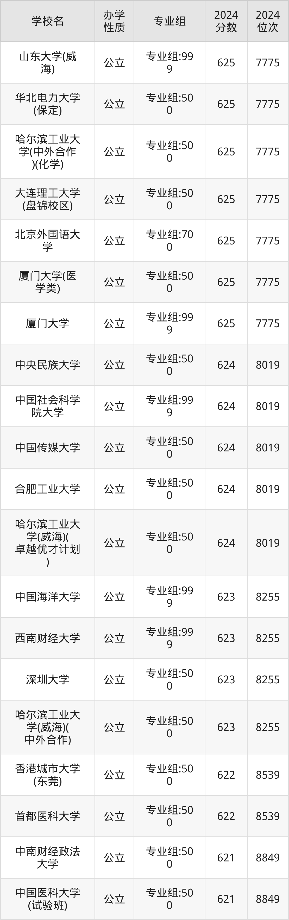 | 山东大学(威 海) | 专业组:99 9 | 625 | 7775 |