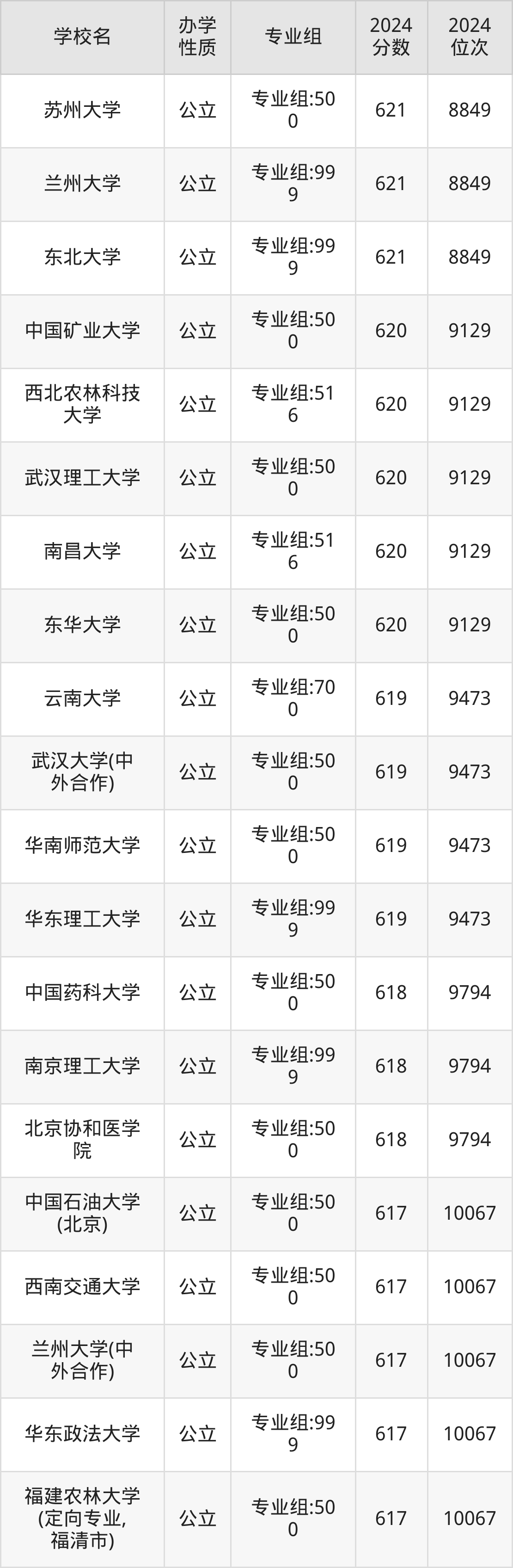 | 西北农林科技 大学 | 专业组:51 6 | 620 | 9129 |