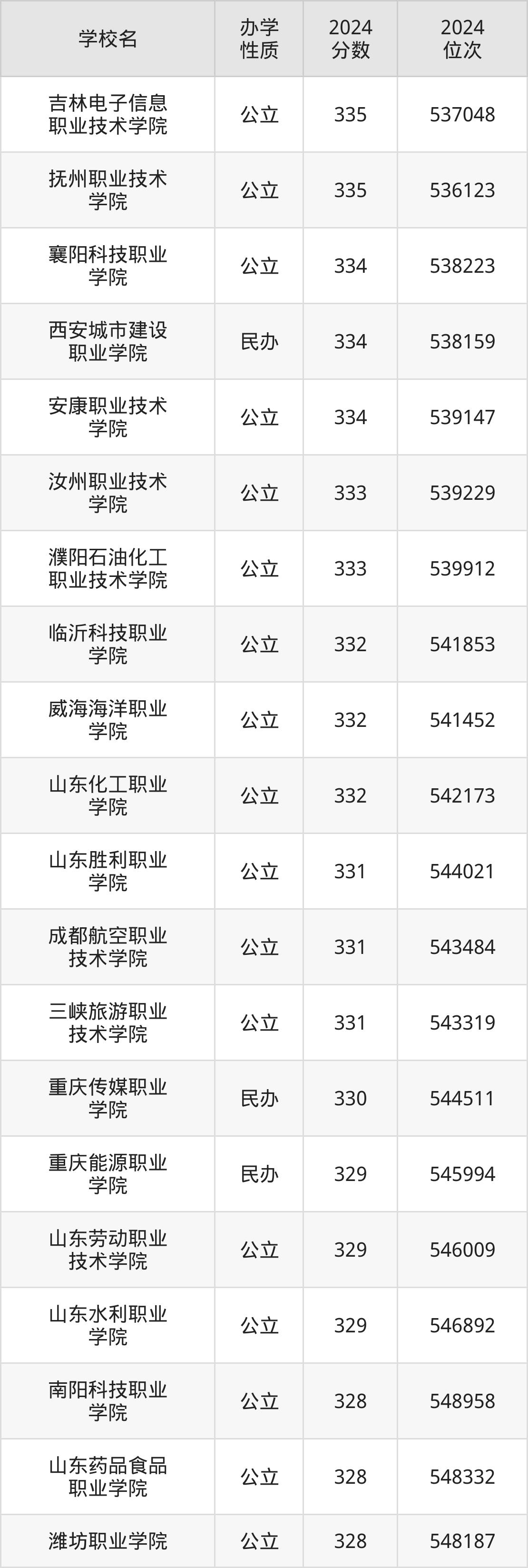 | 山东化工职业 学院 | 332 | 542173 |