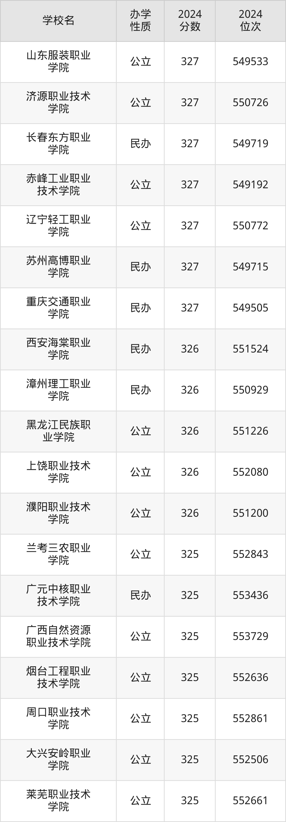 | 长春东方职业 学院 | 327 | 549719 |