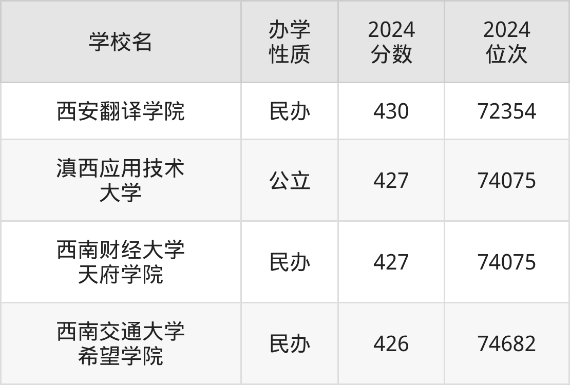 云南425分左右的考生可以上西安翻译学院、滇西应用技术大学、西南财经大学天府学院等院校。