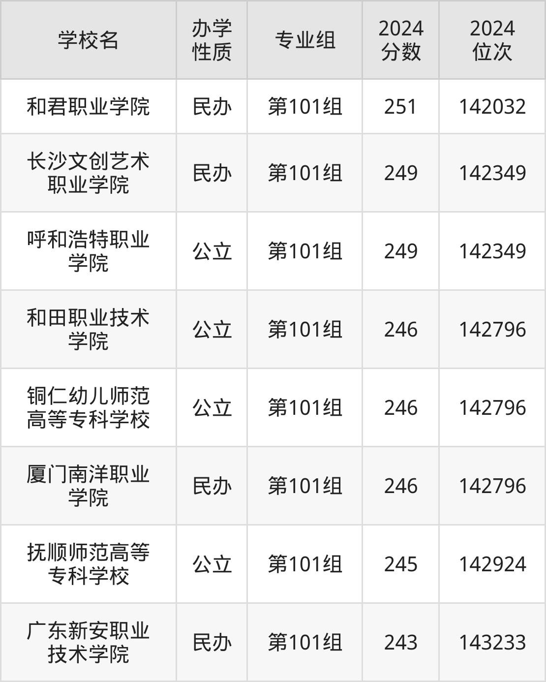 2024年湖南历史类247分考生能上和君职业学院、长沙文创艺术职业学院、呼和浩特职业学院、和田职业技术学院、铜仁幼儿师范高等专科学校等8所专科院校,具体录取分数线及位次为: