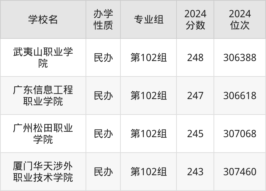 2024年湖南物理类247分考生能上武夷山职业学院、广东信息工程职业学院、广州松田职业学院、厦门华天涉外职业技术学院4所专科院校,具体录取分数线及位次为: