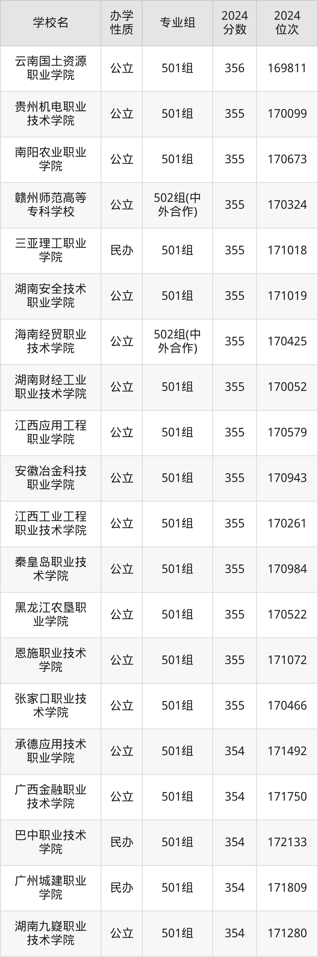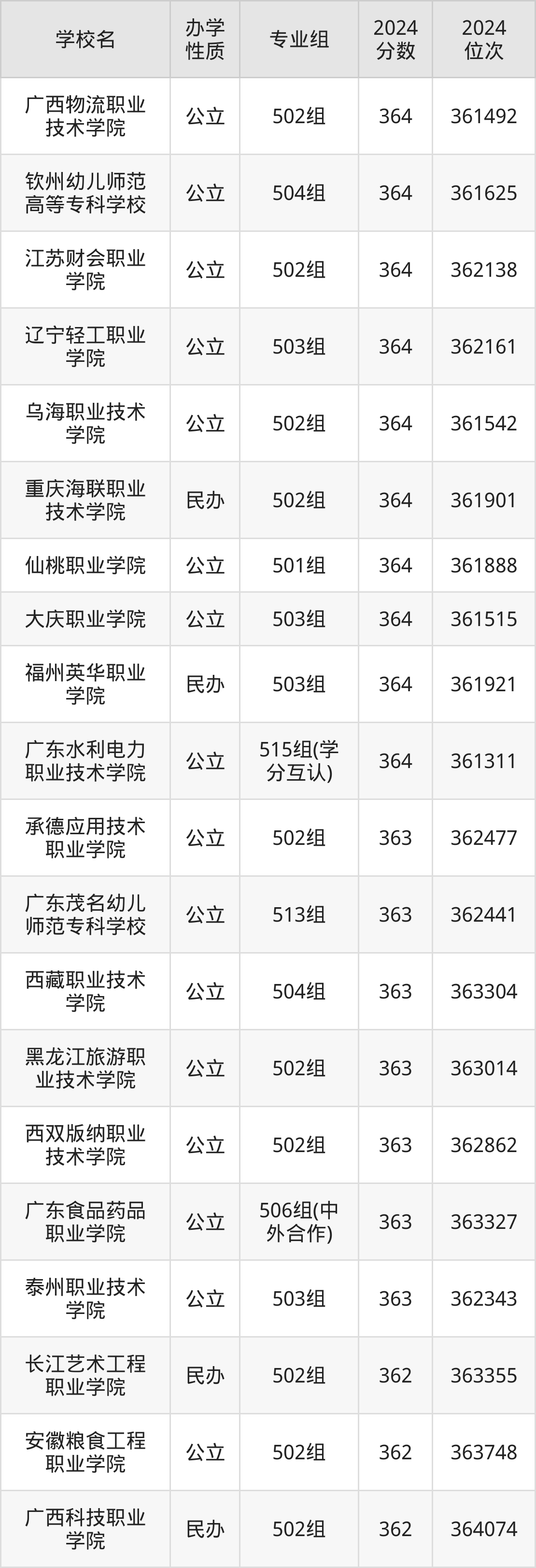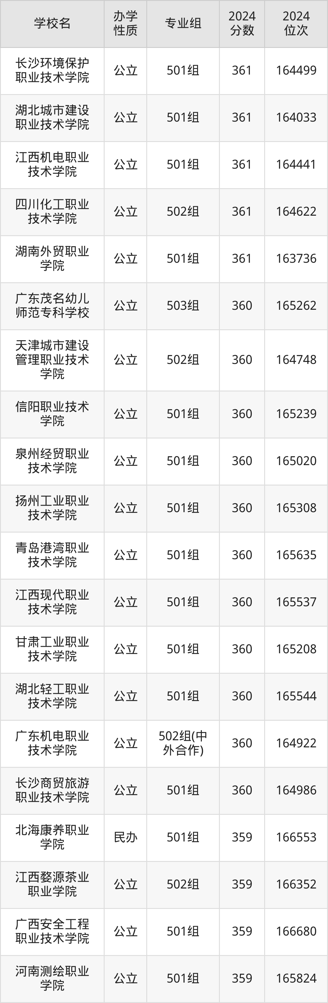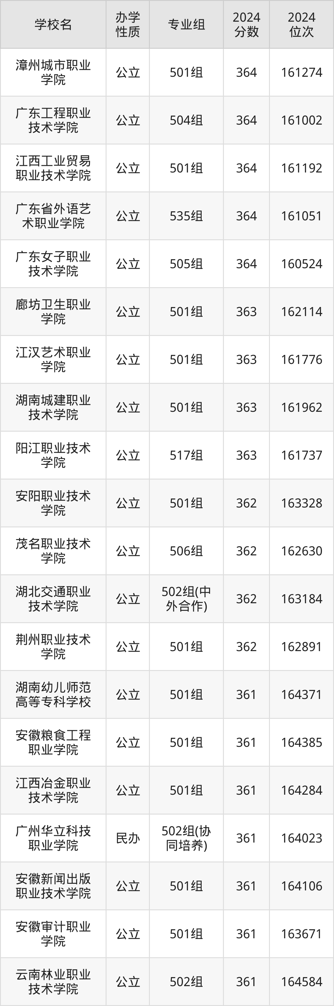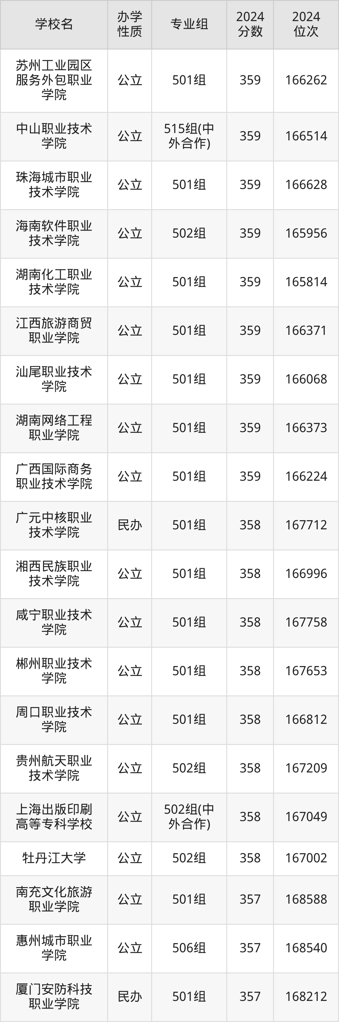 2024年广东历史类359分考生能上漳州城市职业学院、广东工程职业技术学院、江西工业贸易职业技术学院、广东省外语艺术职业学院、广东女子职业技术学院等105所专科院校,具体录取分数线及位次为: