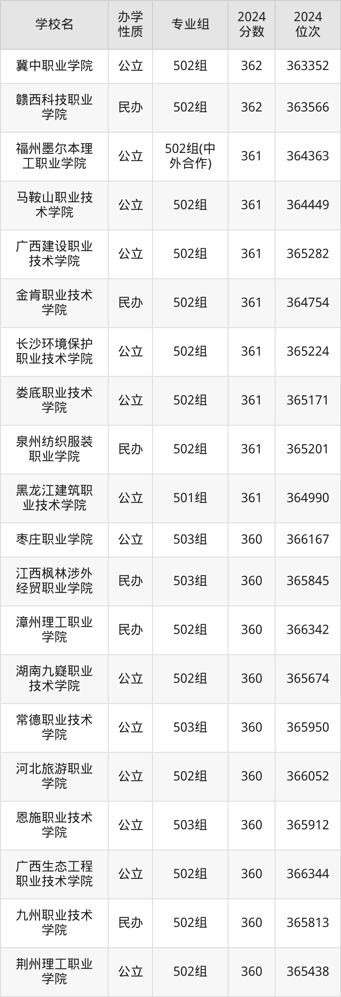 | 漳州理工职业 学院 | 502组 | 360 | 366342 |