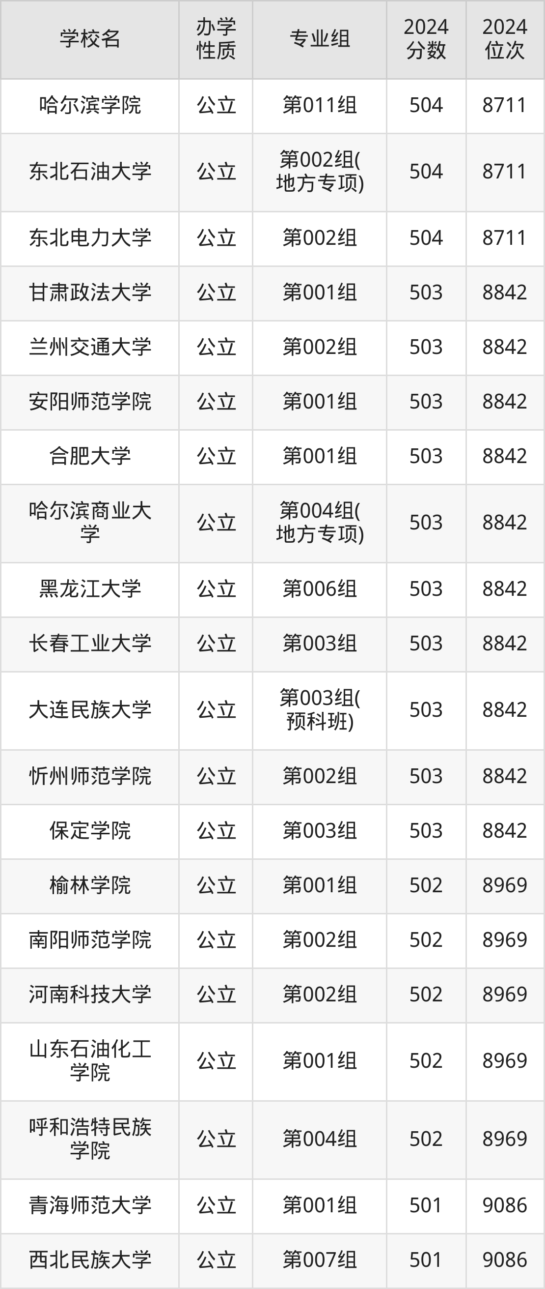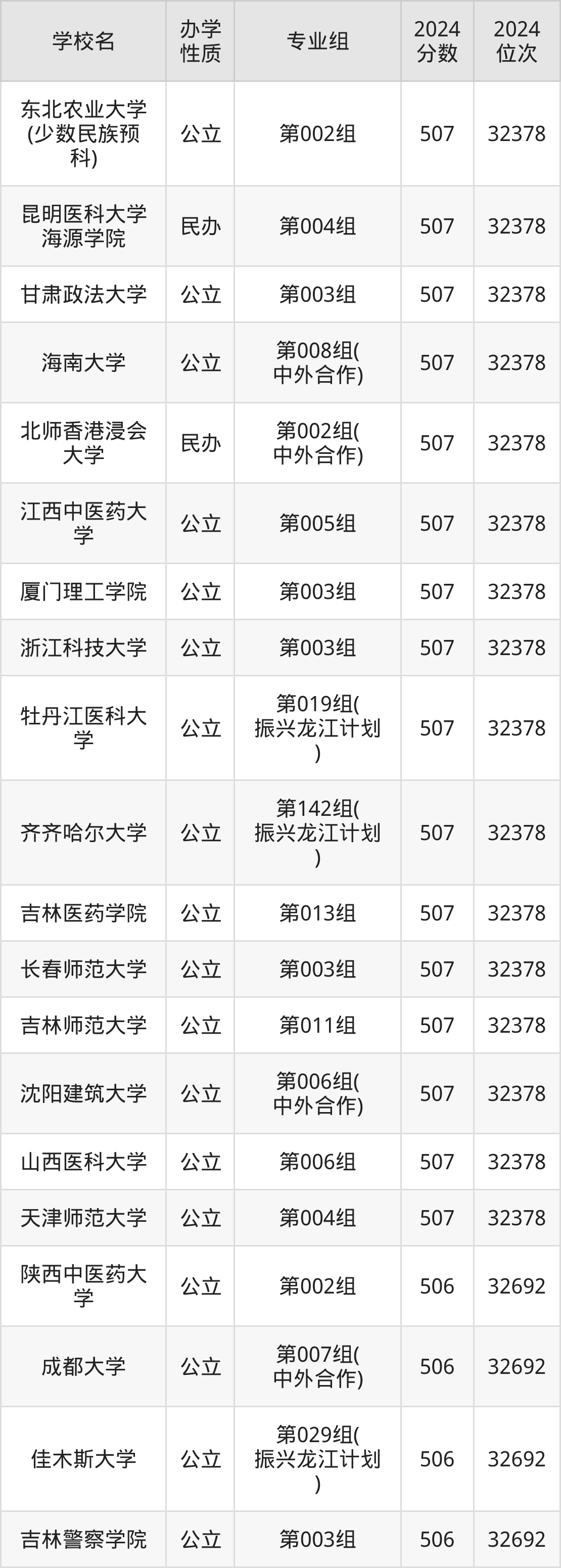 | 东北农业大学 (少数民族预 科) | 第002组 | 507 | 32378 |