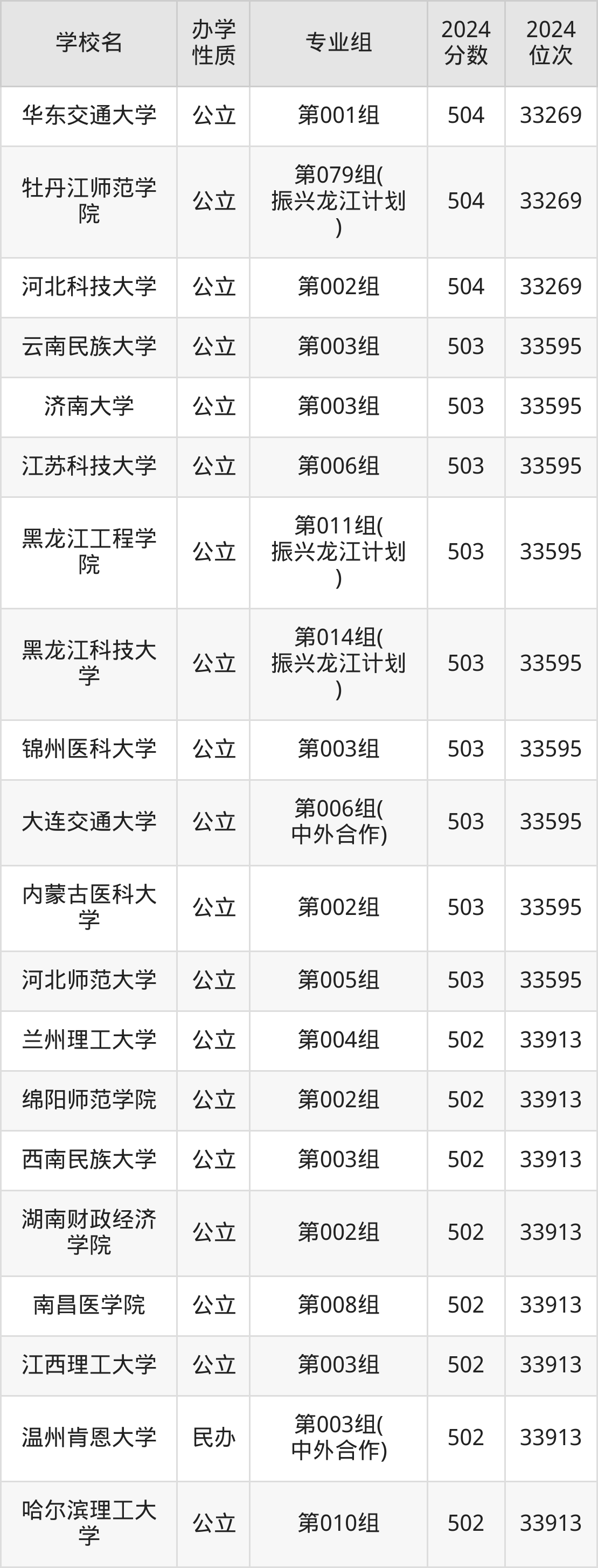 | 齐齐哈尔大学 | 第137组( 振兴龙江计划 ) | 502 | 33913 |