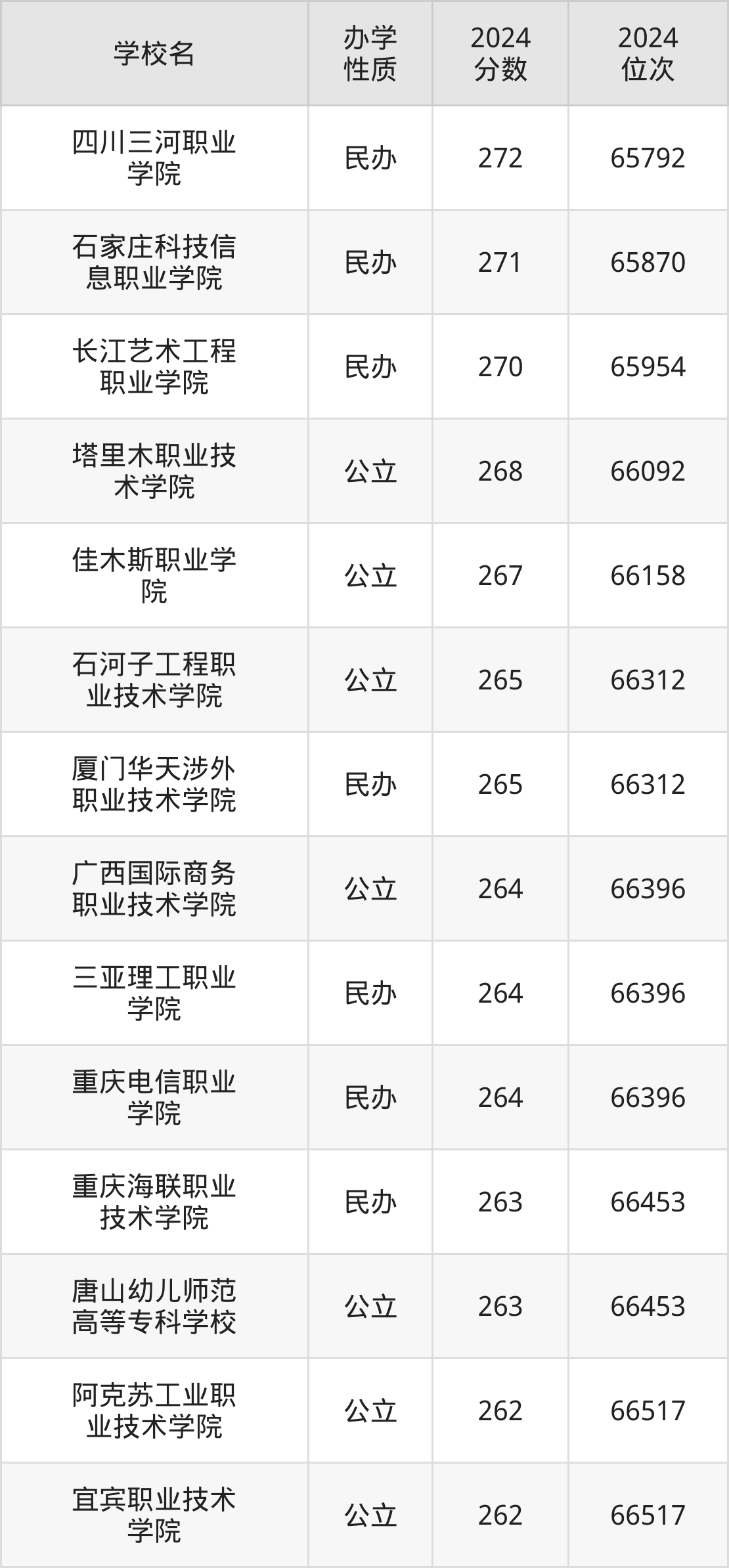 2024年重庆历史类267分考生能上四川三河职业学院、石家庄科技信息职业学院、长江艺术工程职业学院、塔里木职业技术学院、佳木斯职业学院等14所专科院校,具体录取分数线及位次为: