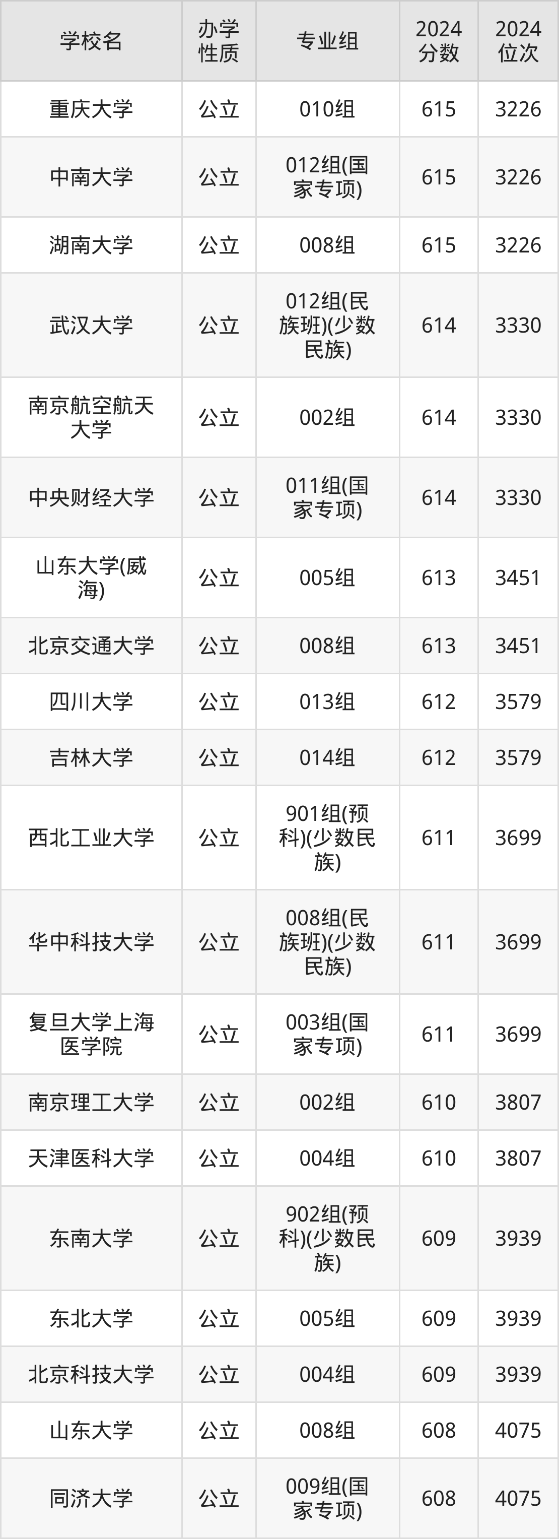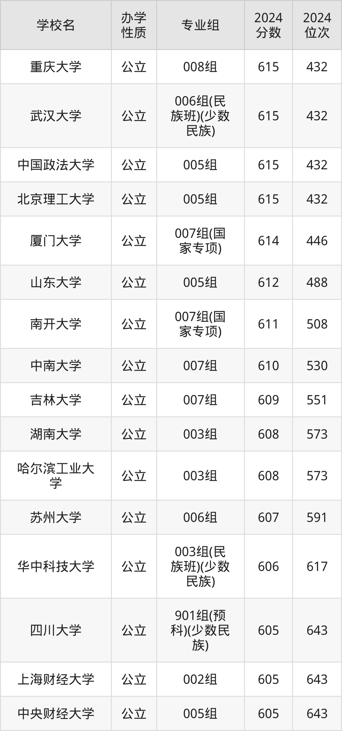 | 武汉大学 | 006组(民 族班)(少数 民族) | 615 | 432 |
