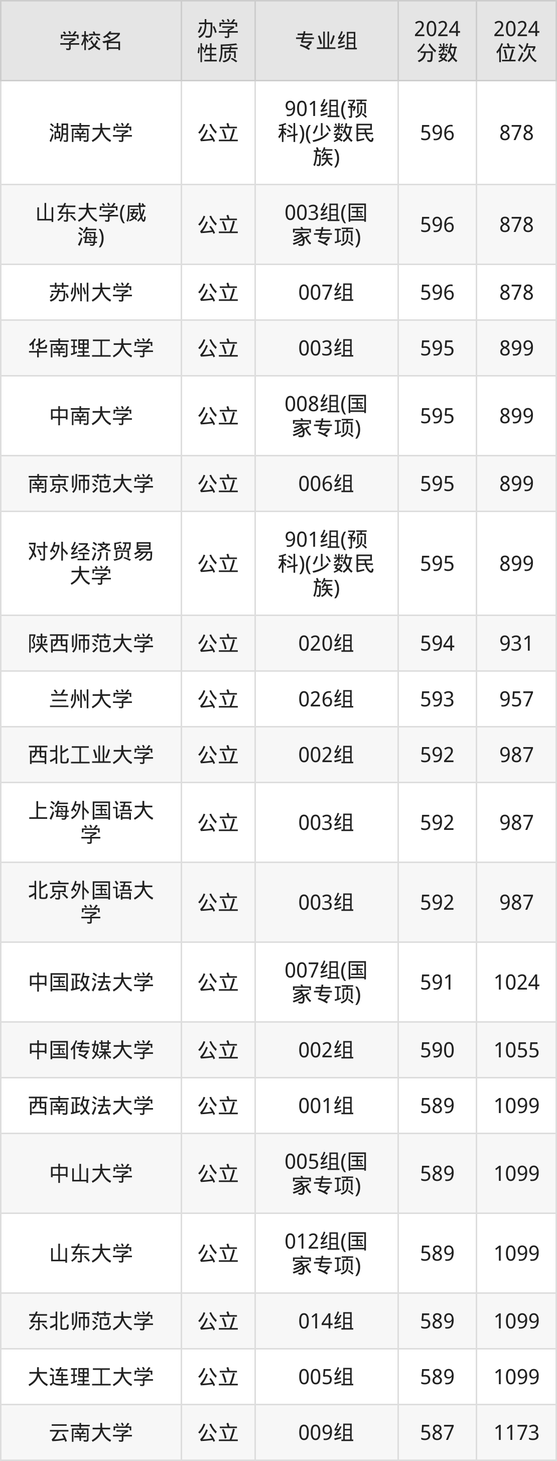 | 湖南大学 | 901组(预 科)(少数民 族) | 596 | 878 |