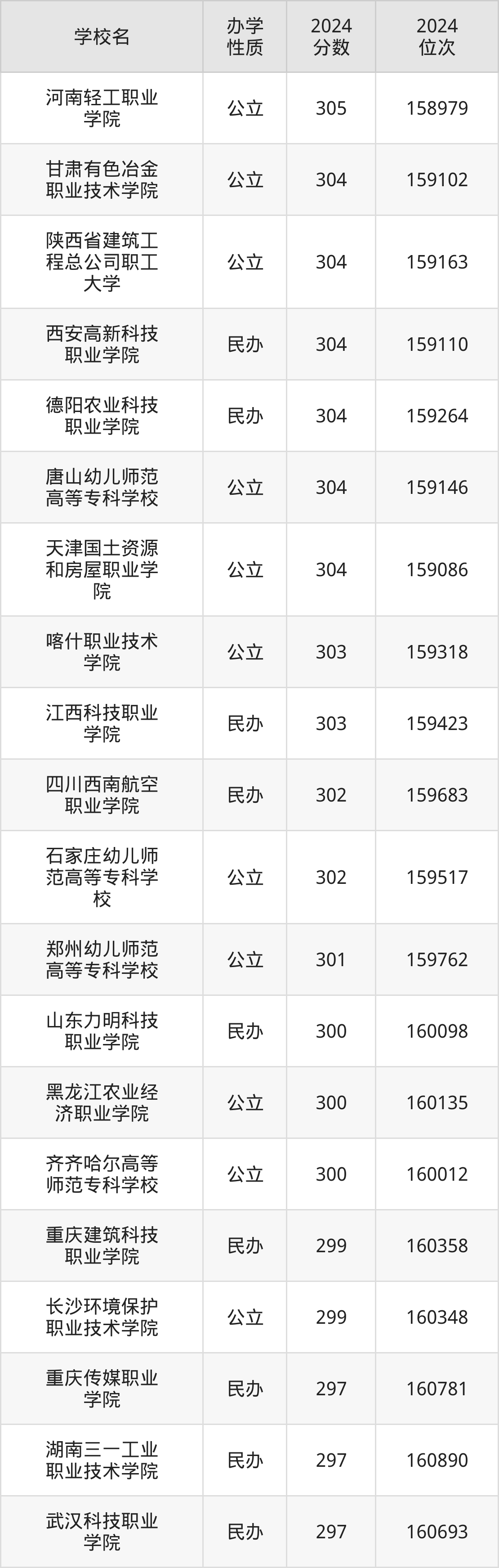 | 武汉科技职业 学院 | 297 | 160693 |