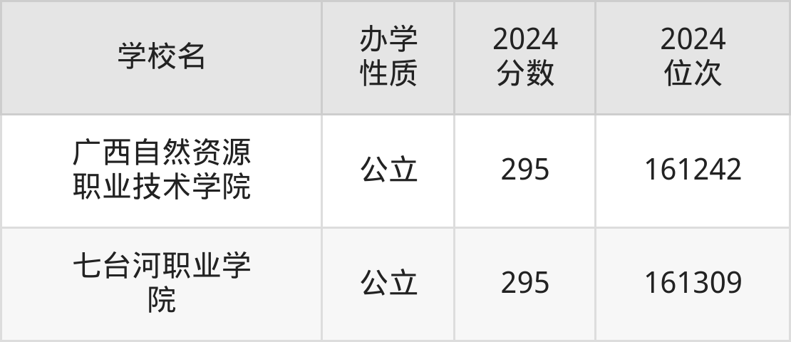 | 广西自然资源 职业技术学院 | 295 | 161242 |