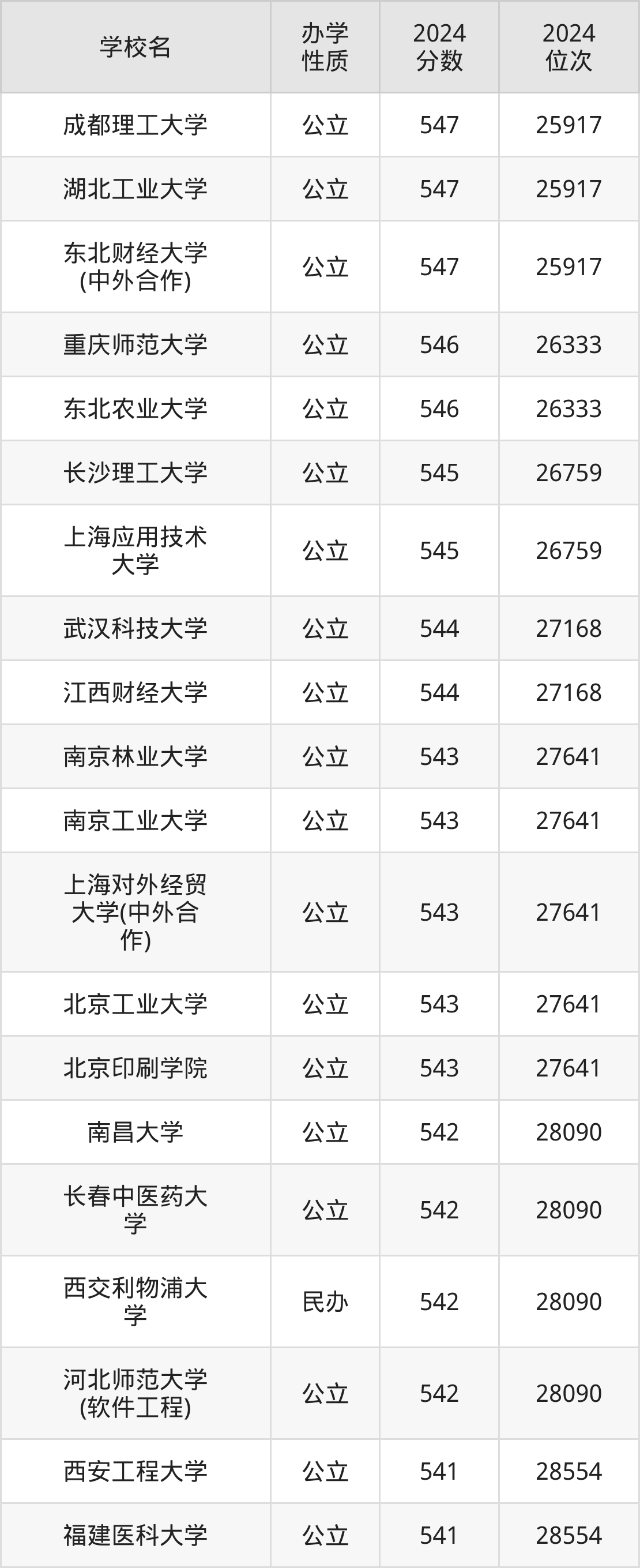 2024年云南理科542分考生能上成都理工大学、湖北工业大学、东北财经大学(中外合作)、重庆师范大学、东北农业大学等39所一本院校,具体录取分数线及位次为: