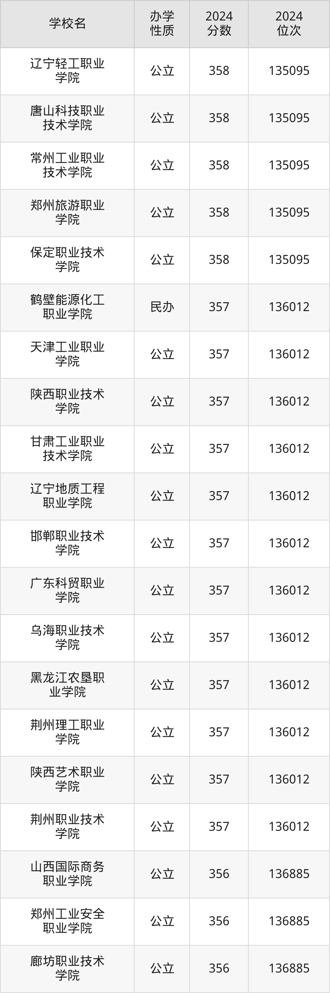 | 保定职业技术 学院 | 358 | 135095 |