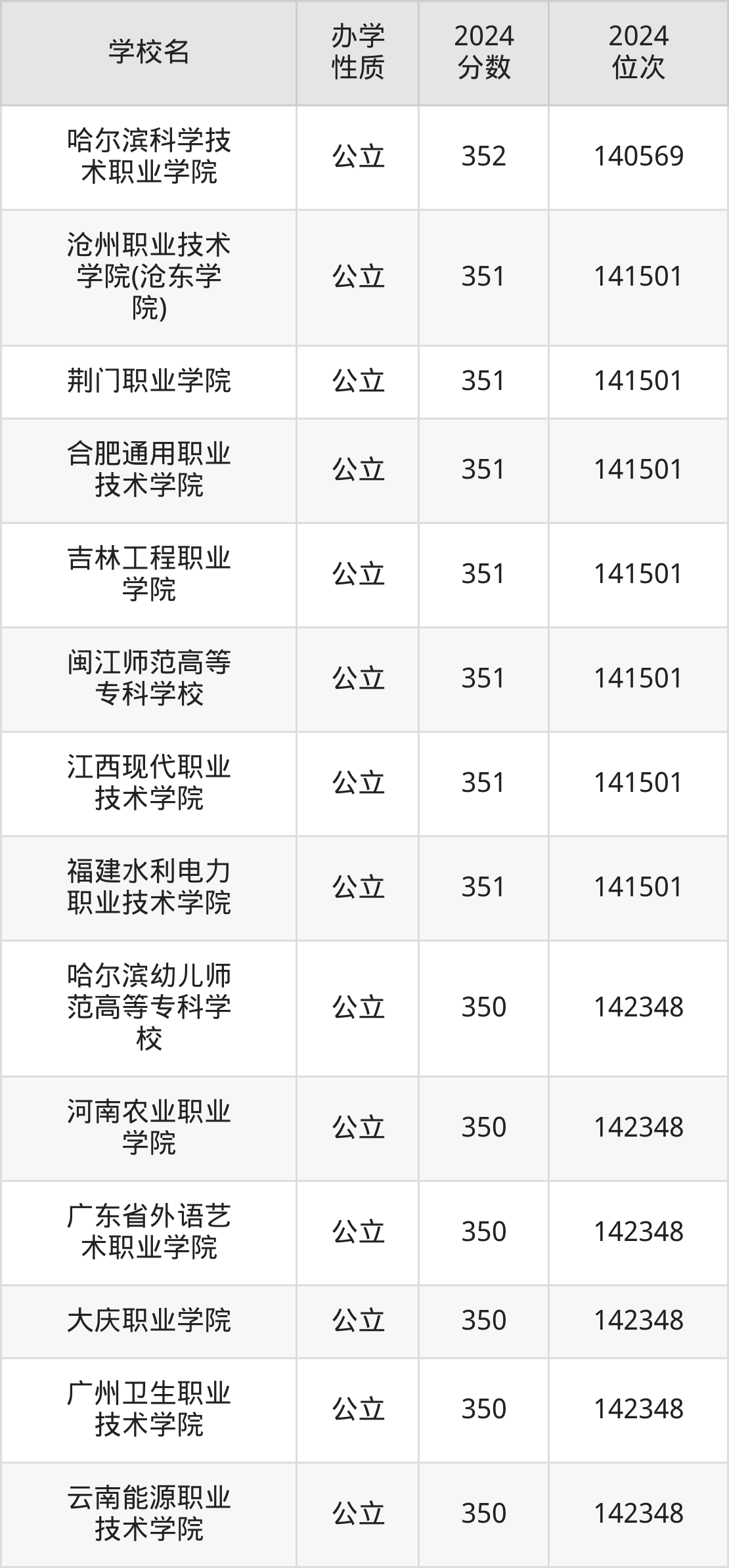 | 大庆职业学院 | 350 | 142348 |