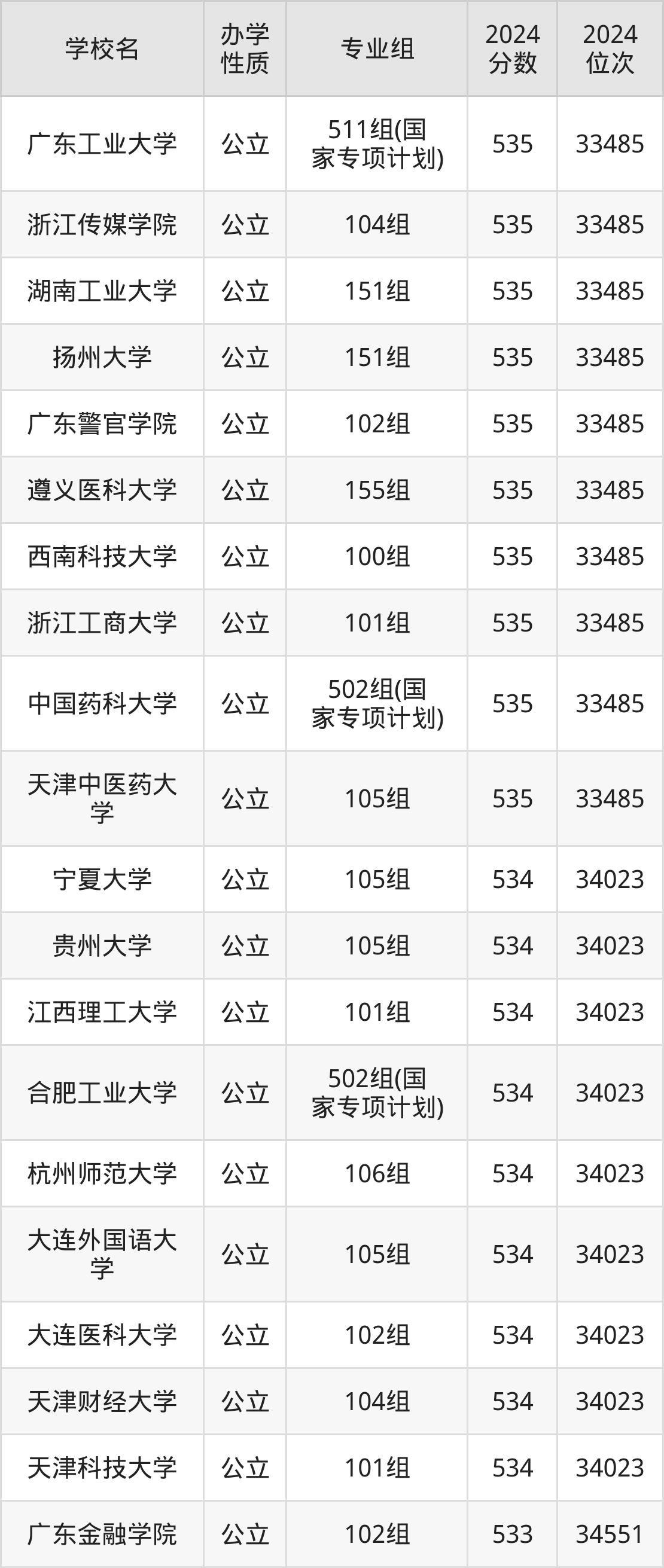 | 中国药科大学 | 502组(国 家专项计划) | 535 | 33485 |