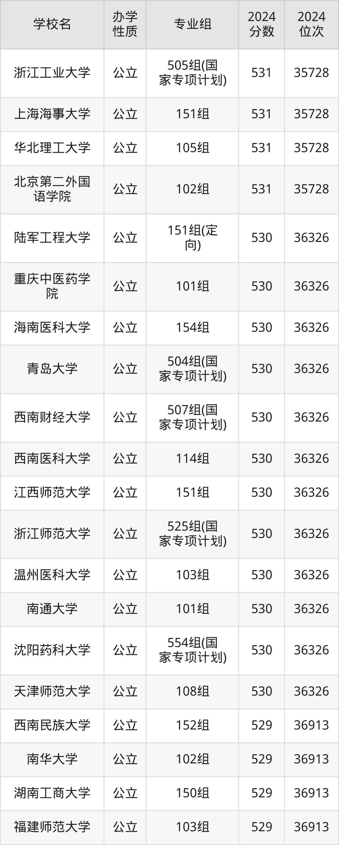 | 浙江工业大学 | 505组(国 家专项计划) | 531 | 35728 |