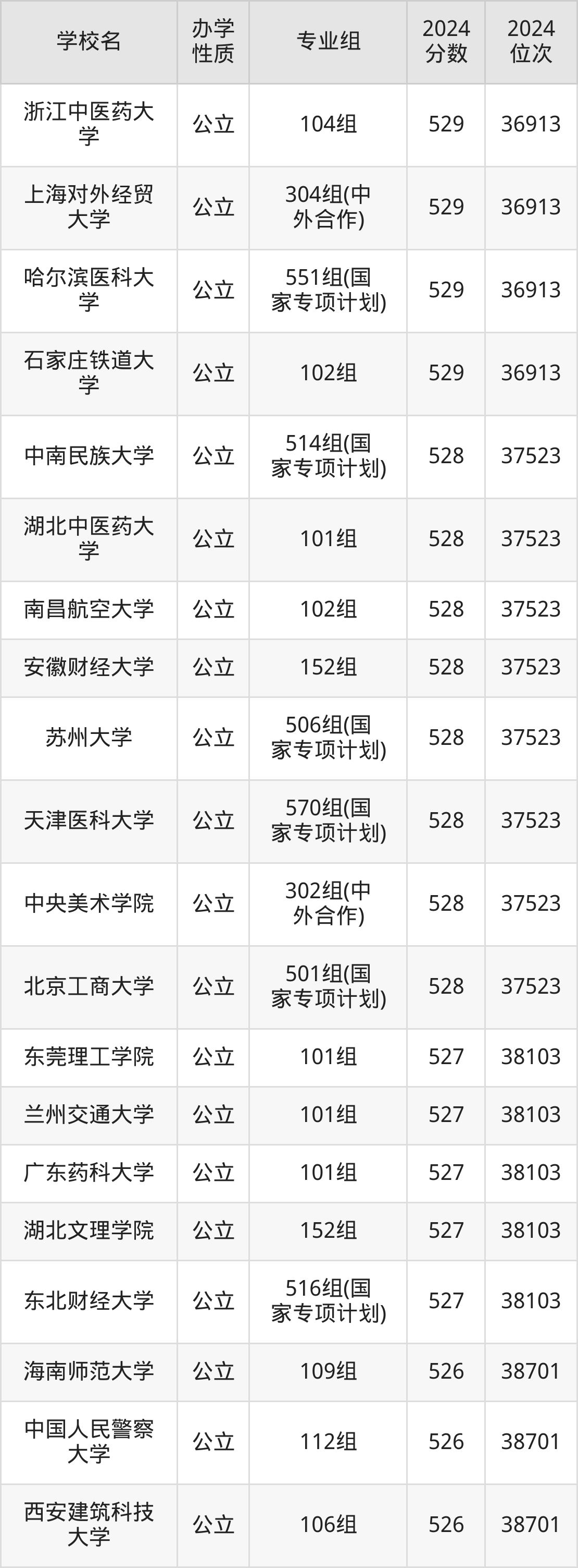 | 东北财经大学 | 516组(国 家专项计划) | 527 | 38103 |