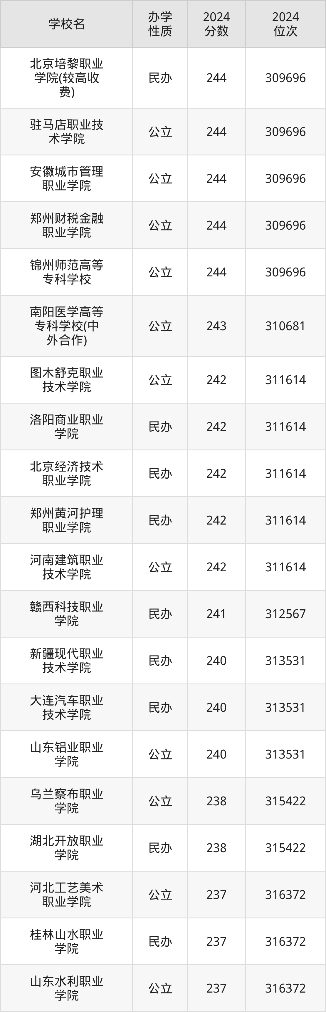 2024年河南文科239分考生能上北京培黎职业学院(较高收费)、驻马店职业技术学院、安徽城市管理职业学院、郑州财税金融职业学院、锦州师范高等专科学校等35所专科院校,具体录取分数线及位次为: