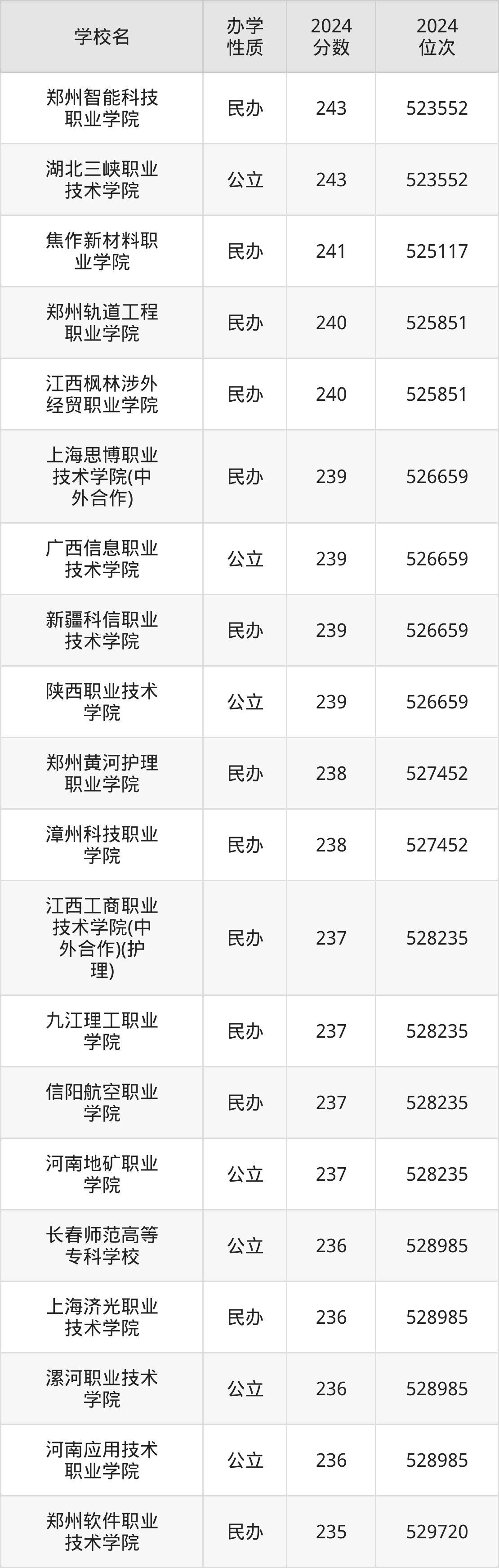 2024年河南理科239分考生能上郑州智能科技职业学院、湖北三峡职业技术学院、焦作新材料职业学院、郑州轨道工程职业学院、江西枫林涉外经贸职业学院等24所专科院校,具体录取分数线及位次为: