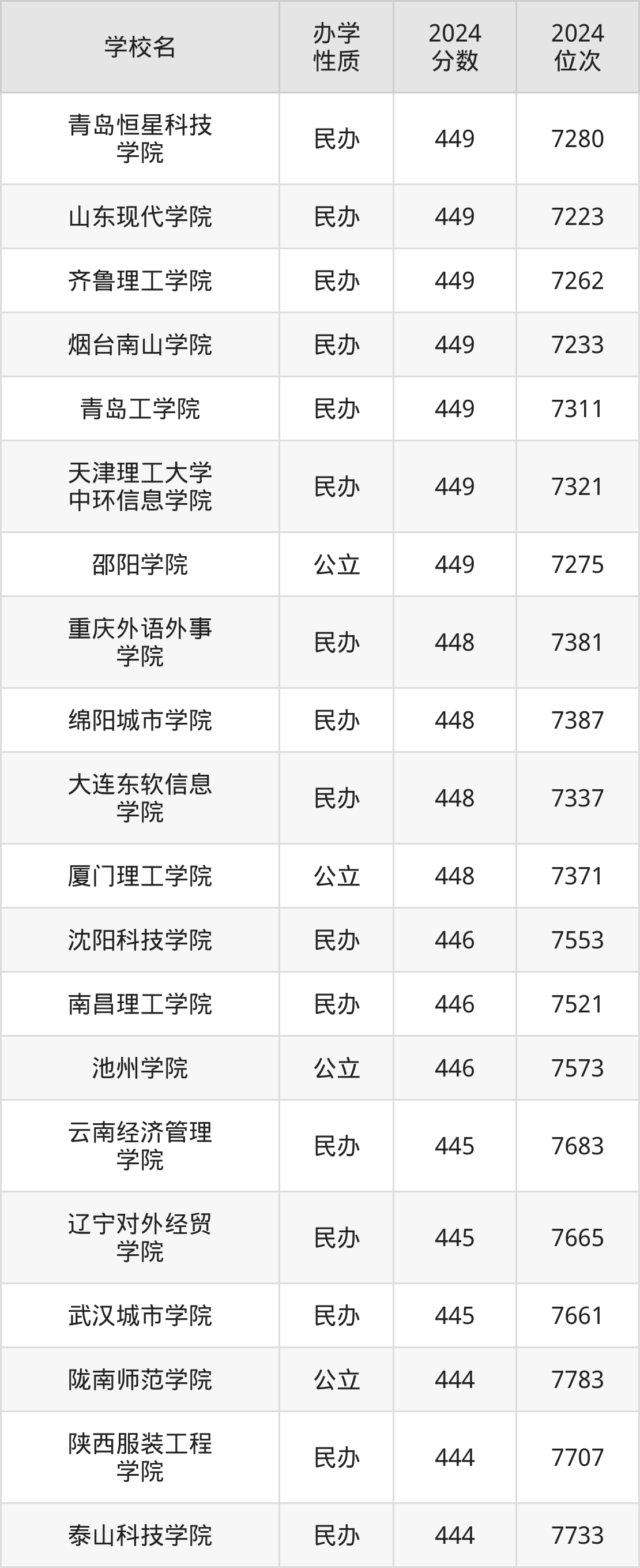 2024年宁夏文科444分考生能上青岛恒星科技学院、山东现代学院、齐鲁理工学院、烟台南山学院、青岛工学院等41所二本院校,具体录取分数线及位次为: