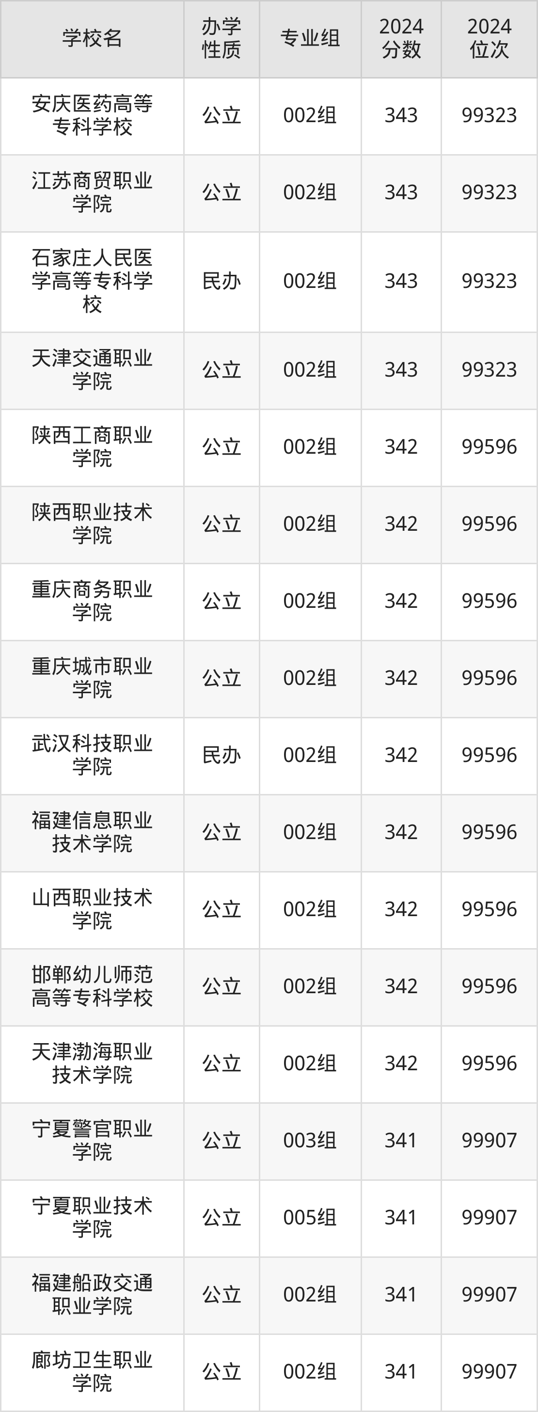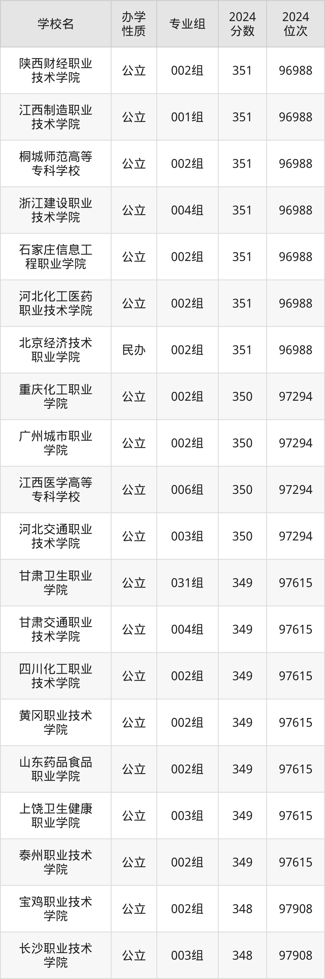 2024年甘肃物理类346分考生能上陕西财经职业技术学院、江西制造职业技术学院、桐城师范高等专科学校、浙江建设职业技术学院、石家庄信息工程职业学院等77所专科院校,具体录取分数线及位次为: