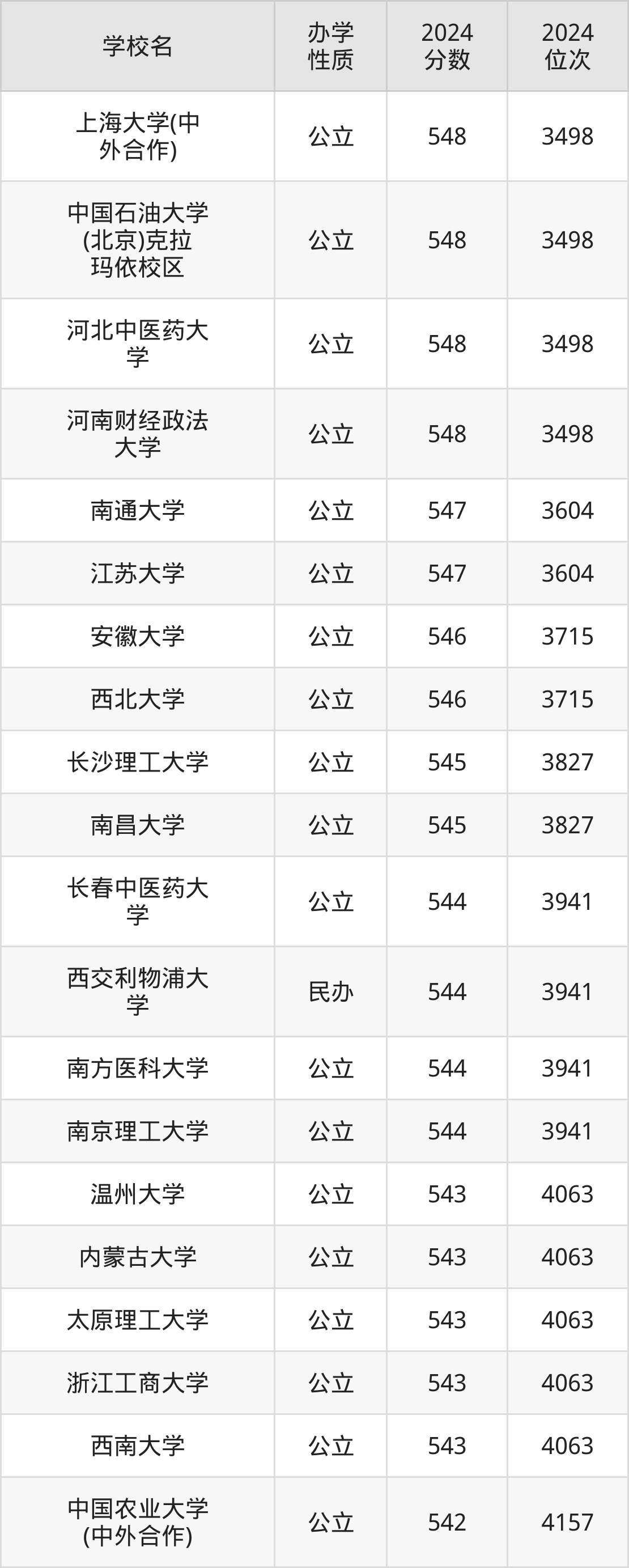 山西543分左右的考生可以上上海大学(中外合作)、中国石油大学(北京)克拉玛依校区、河北中医药大学等院校,刚好在543分的院校有温州大学、内蒙古大学、太原理工大学等。