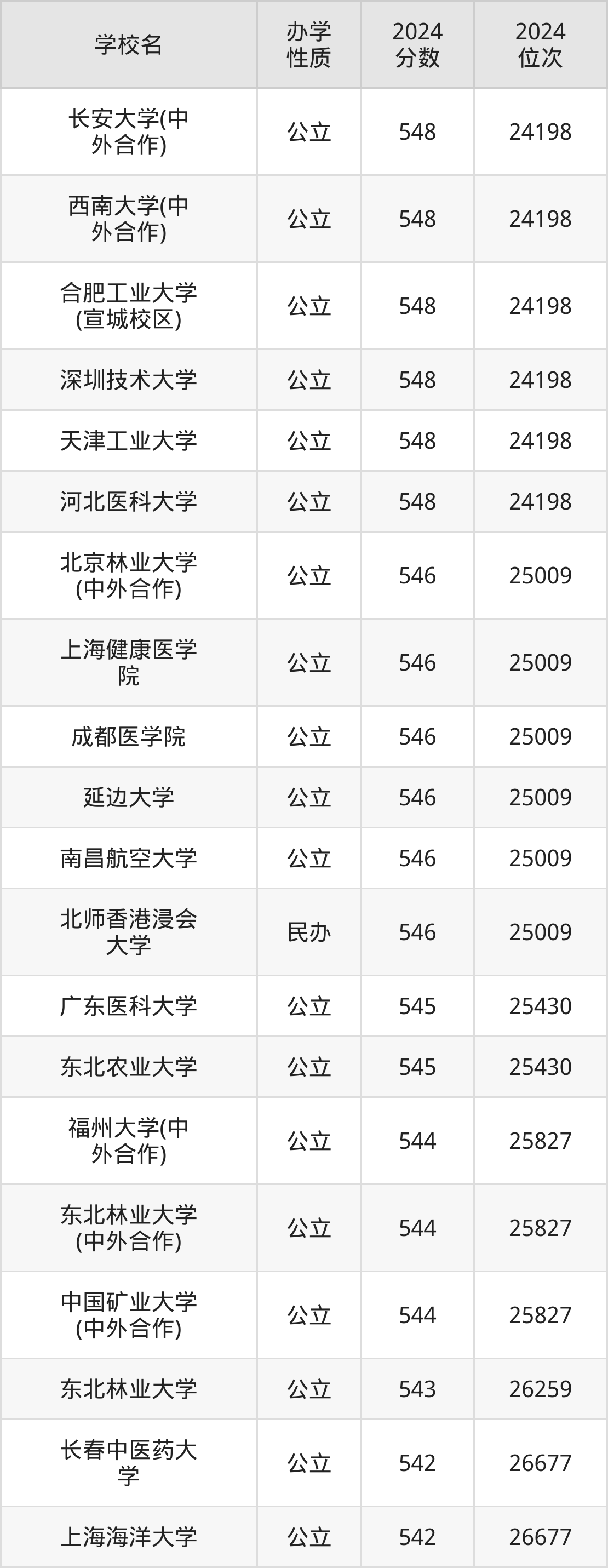 山西543分左右的考生可以上长安大学(中外合作)、西南大学(中外合作)、合肥工业大学(宣城校区)等院校,刚好在543分的院校有东北林业大学。