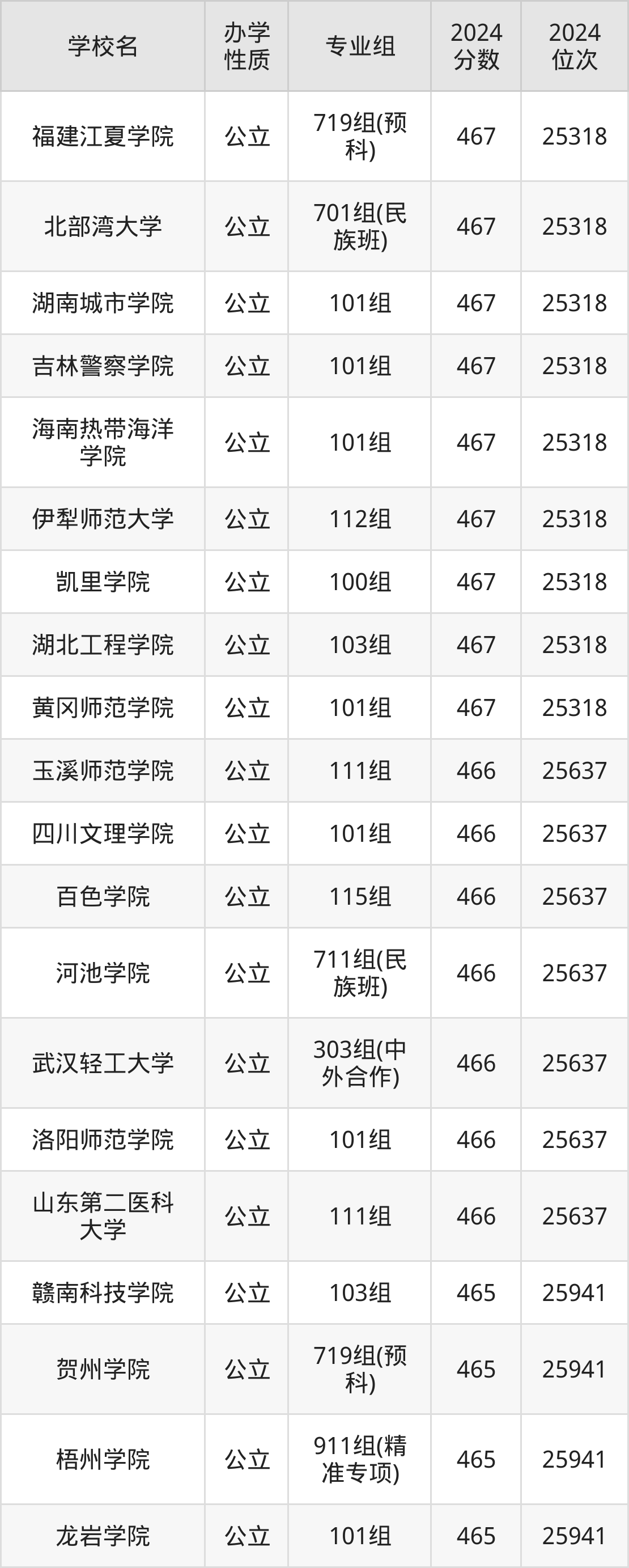 2024年广西历史类462分考生能上福建江夏学院、北部湾大学、湖南城市学院、吉林警察学院、海南热带海洋学院等87所二本院校,具体录取分数线及位次为: