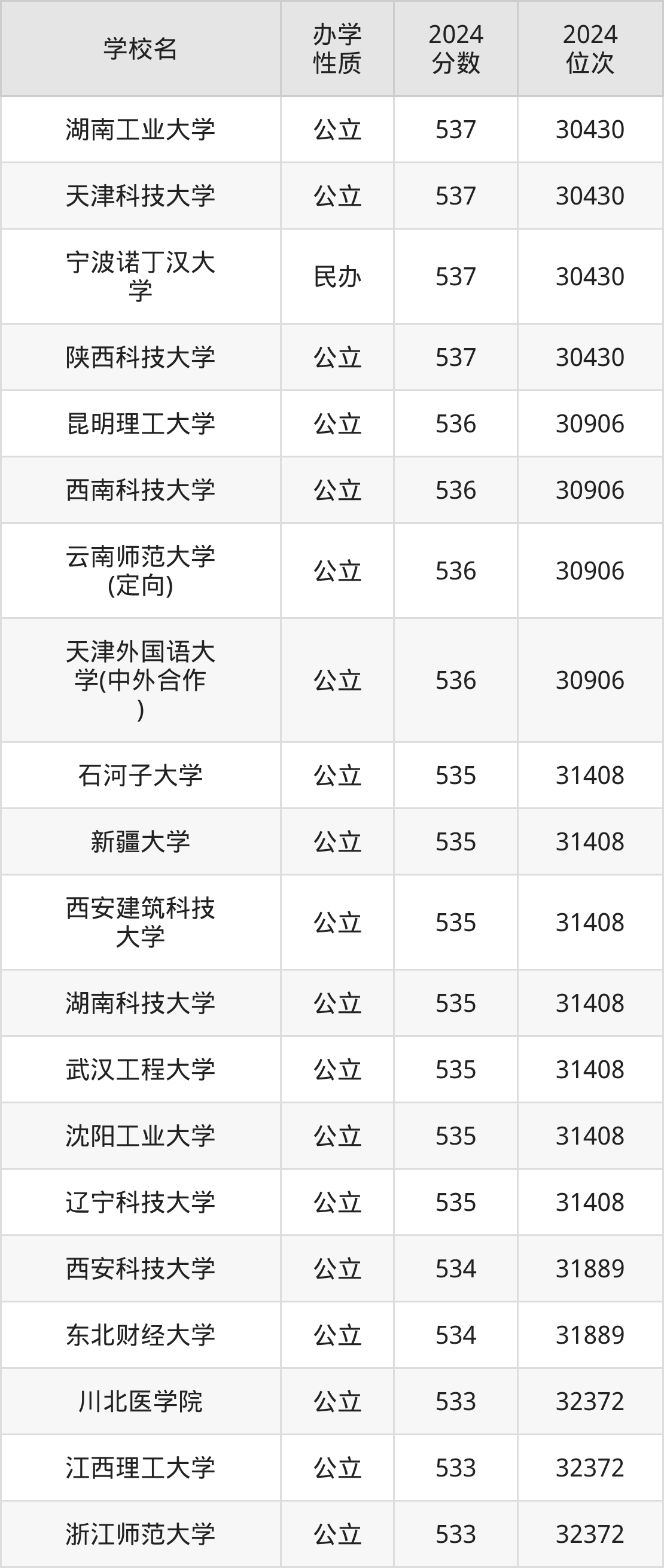 2024年云南理科532分考生能上湖南工业大学、天津科技大学、宁波诺丁汉大学、陕西科技大学、昆明理工大学等54所一本院校,具体录取分数线及位次为: