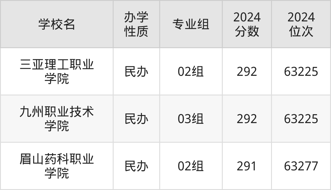 2024年江苏物理类287分考生能上三亚理工职业学院、九州职业技术学院、眉山药科职业学院3所专科院校,具体录取分数线及位次为: