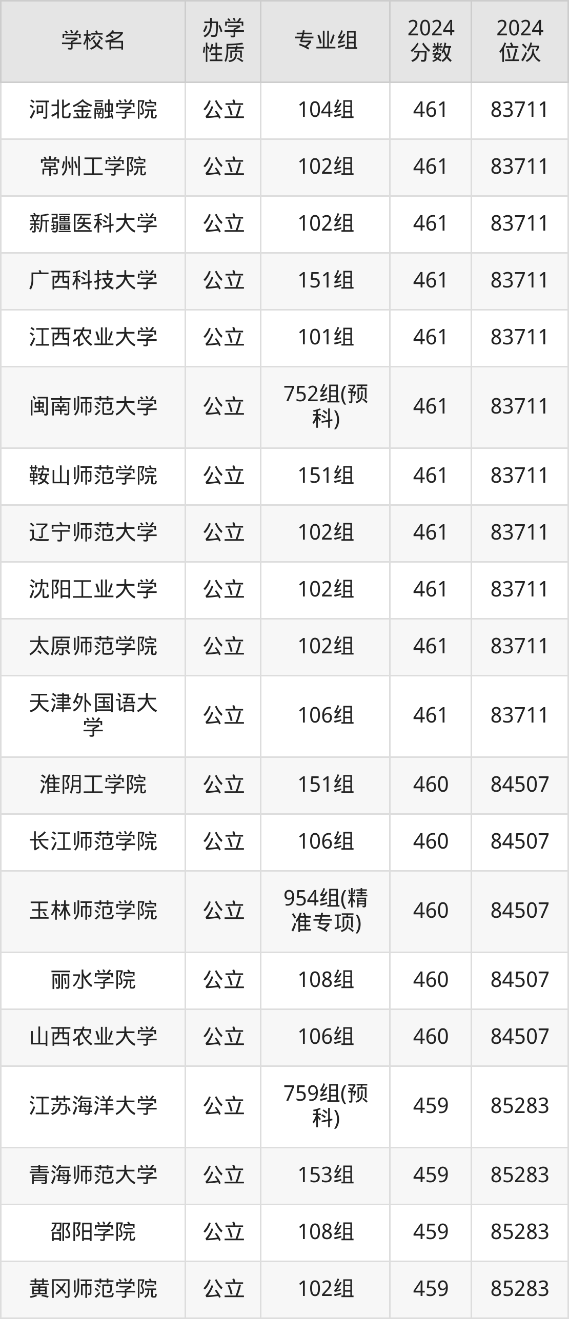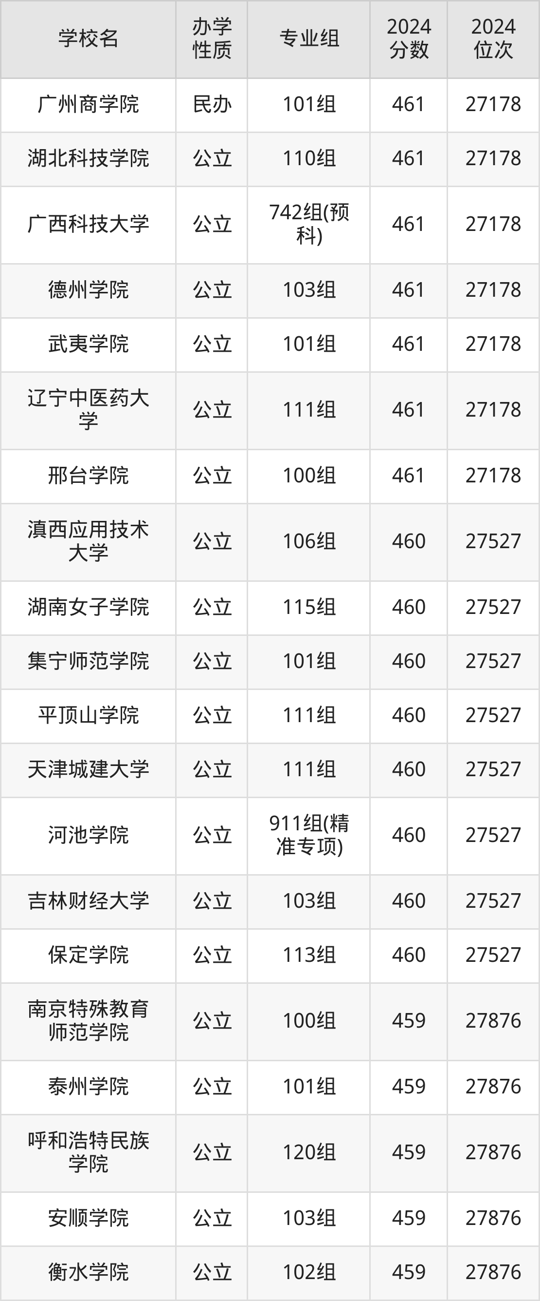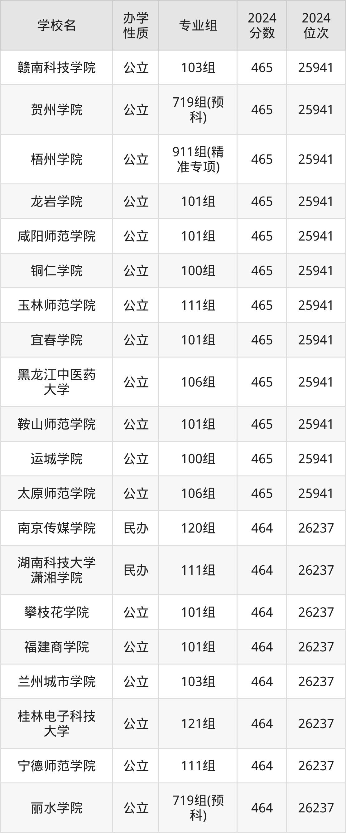 2024年广西历史类460分考生能上赣南科技学院、贺州学院、梧州学院、龙岩学院、咸阳师范学院等85所二本院校,具体录取分数线及位次为: