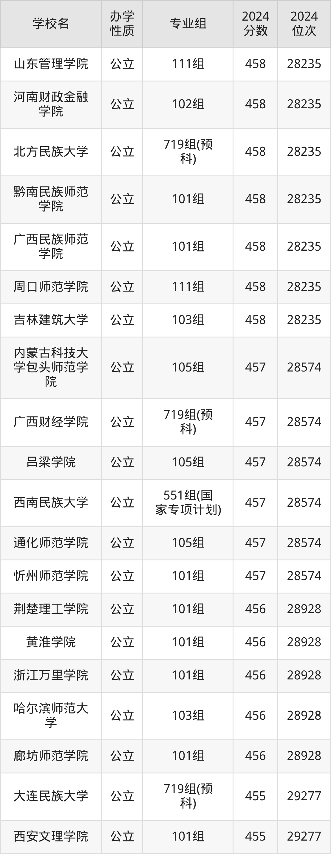 | 大连民族大学 | 719组(预 科) | 455 | 29277 |