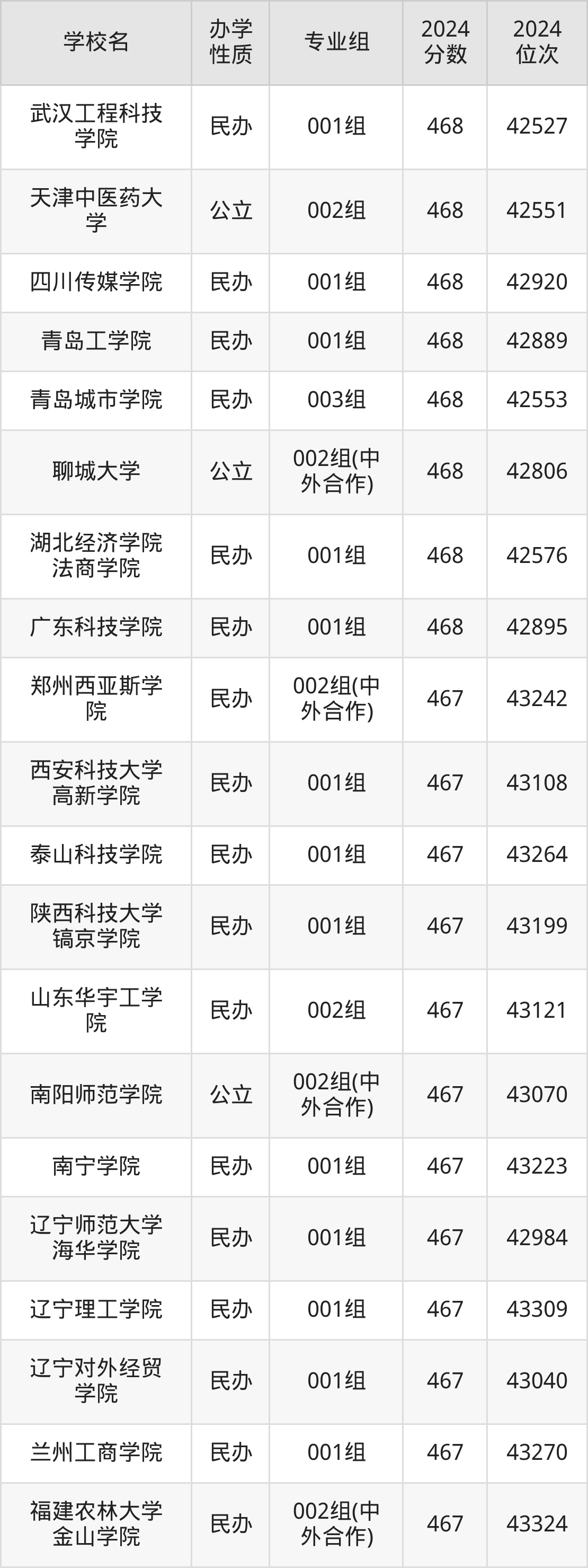 | 聊城大学 | 002组(中 外合作) | 468 | 42806 |