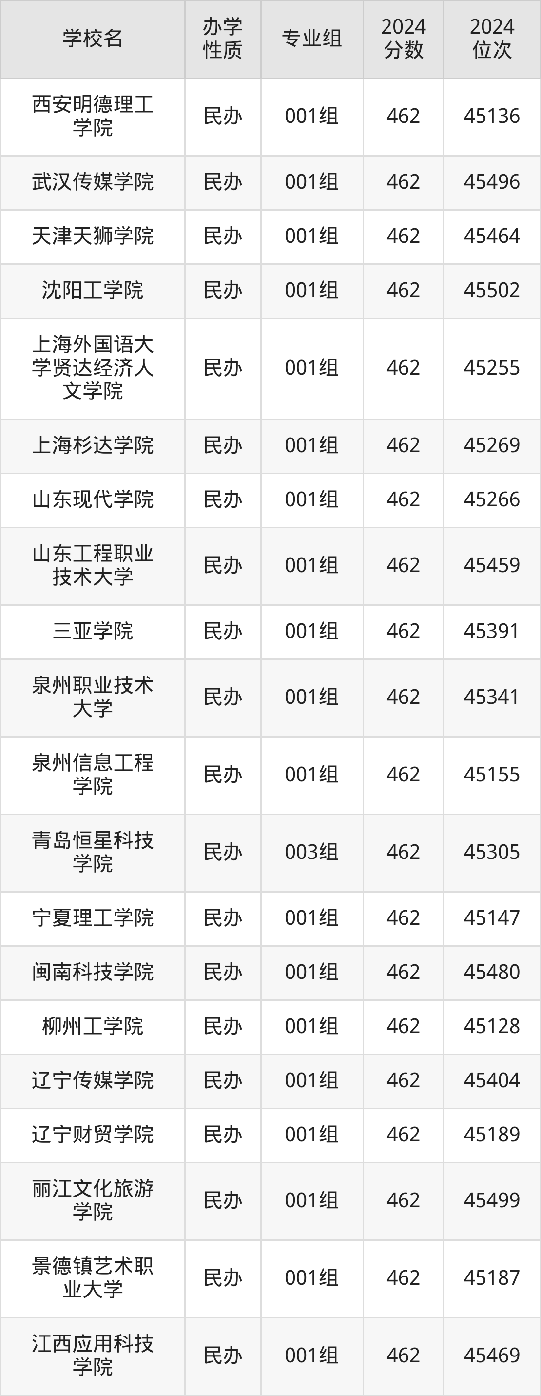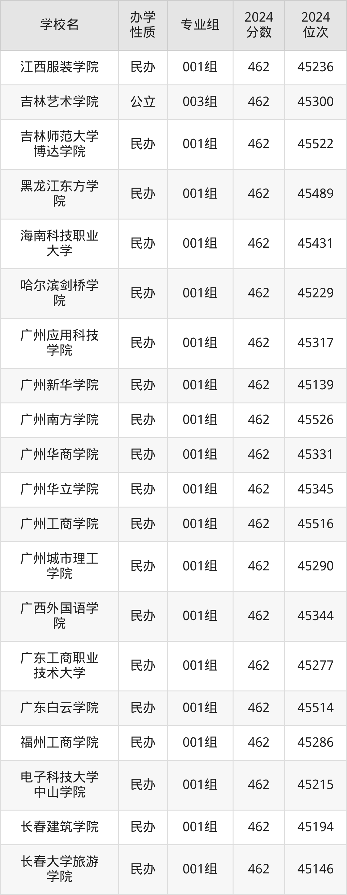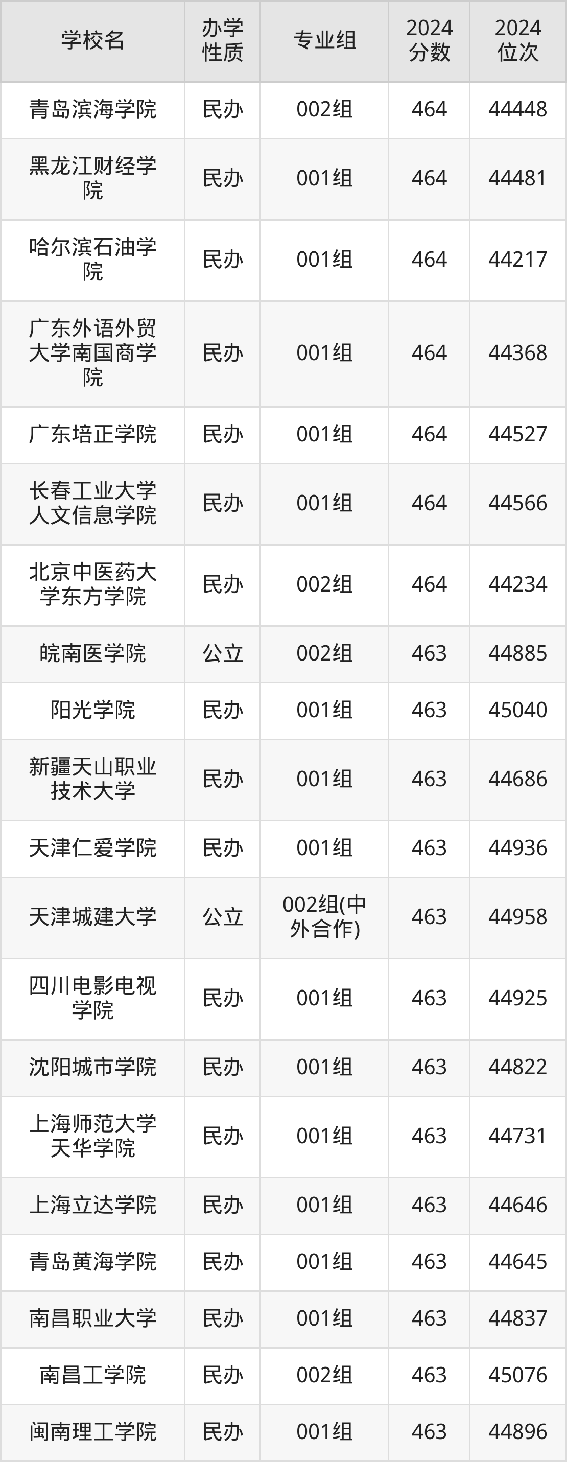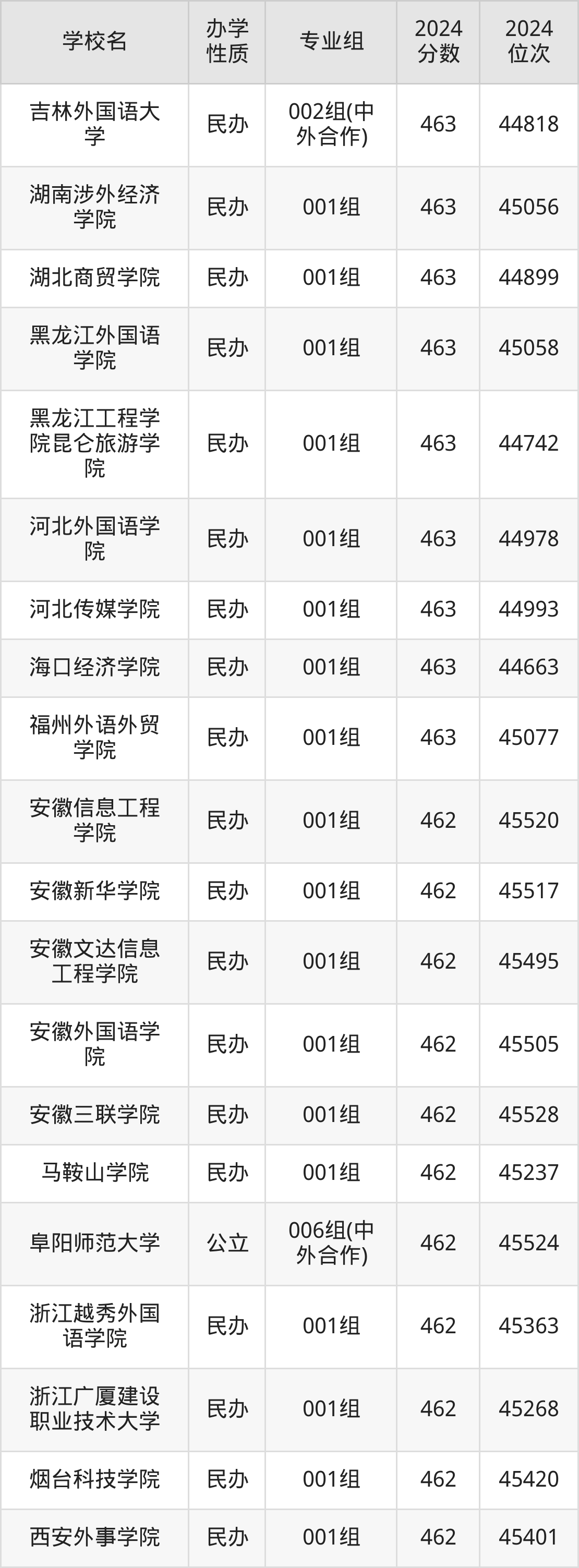 | 吉林外国语大 学 | 002组(中 外合作) | 463 | 44818 |