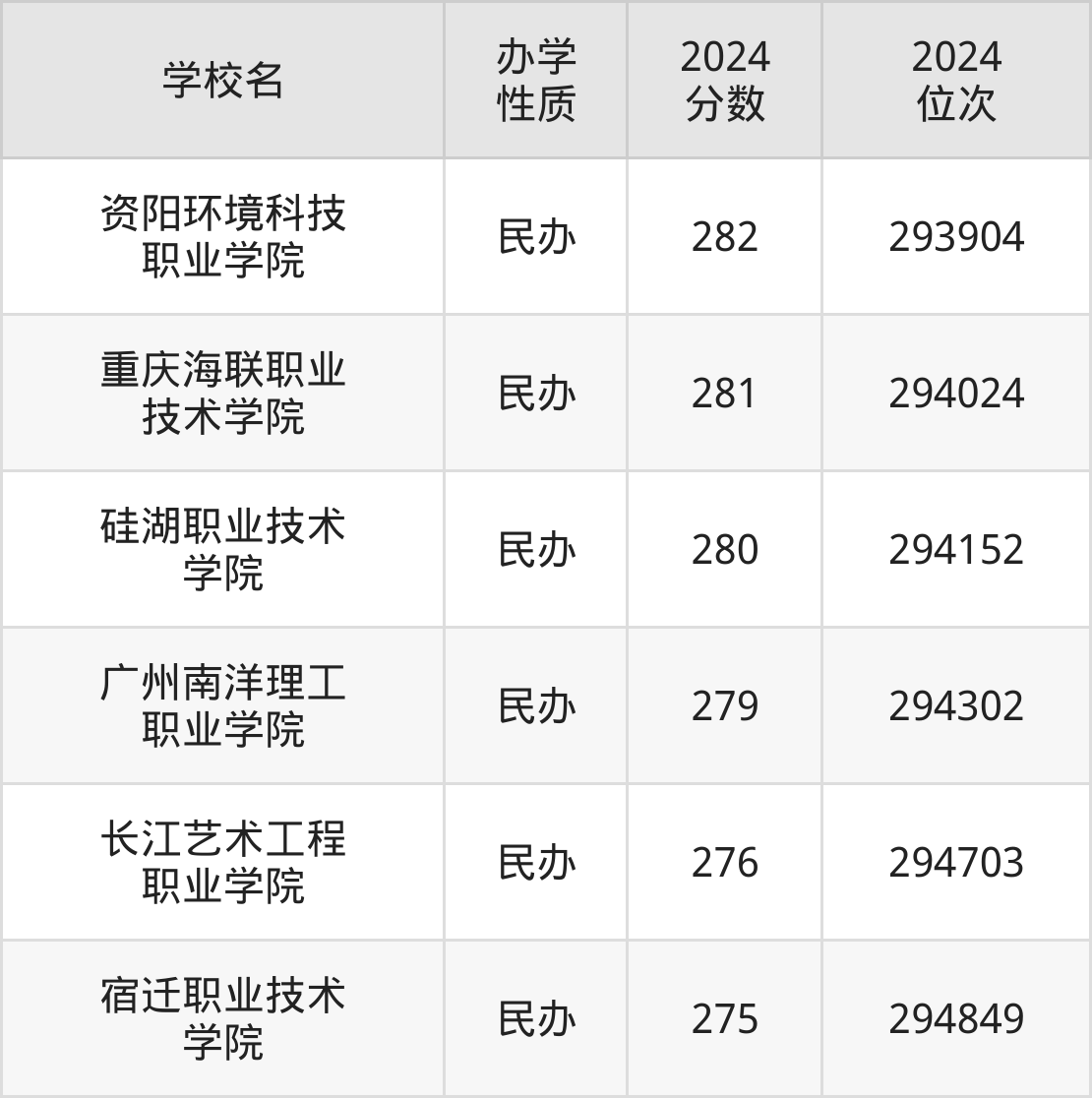 2024年四川理科278分考生能上资阳环境科技职业学院、重庆海联职业技术学院、硅湖职业技术学院、广州南洋理工职业学院、长江艺术工程职业学院等6所专科院校,具体录取分数线及位次为: