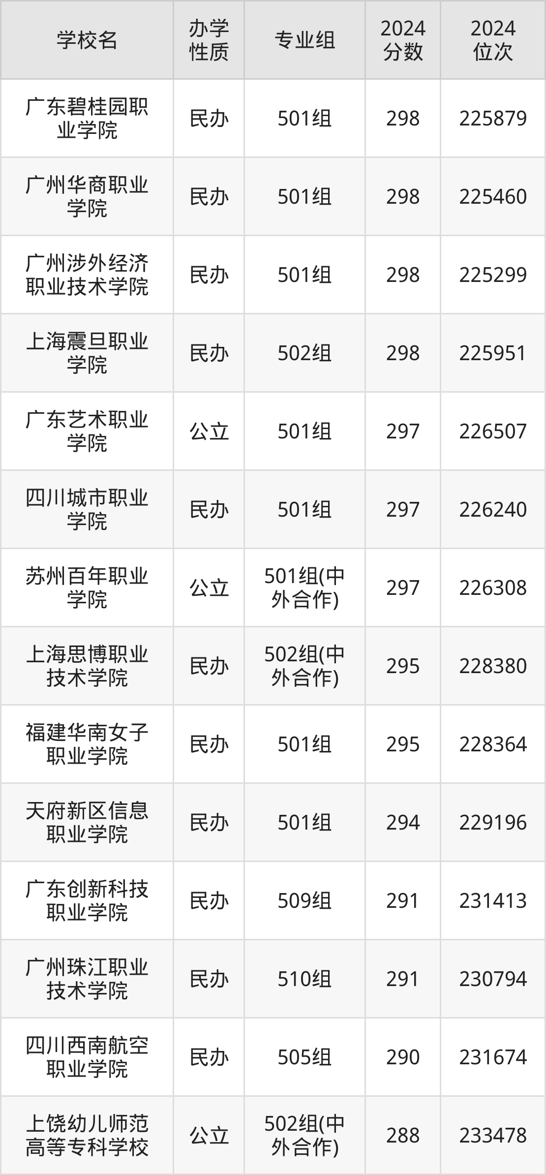 2024年广东物理类293分考生能上三亚中瑞酒店管理职业学院、上海出版印刷高等专科学校、惠州经济职业技术学院、扬州中瑞酒店职业学院、广东创新科技职业学院等9所专科院校,具体录取分数线及位次为: