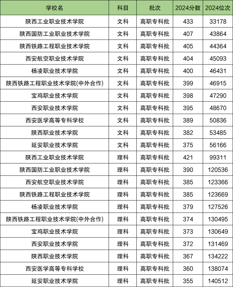 2025年陕西省前十名专科大学在陕西省理科招生分数线在421分~355分之间,最低位次在99311~140512名。如陕西工业职业技术学院最低421分、陕西铁路工程职业技术学院最低385分、陕西国防工业职业技术学院最低390分。