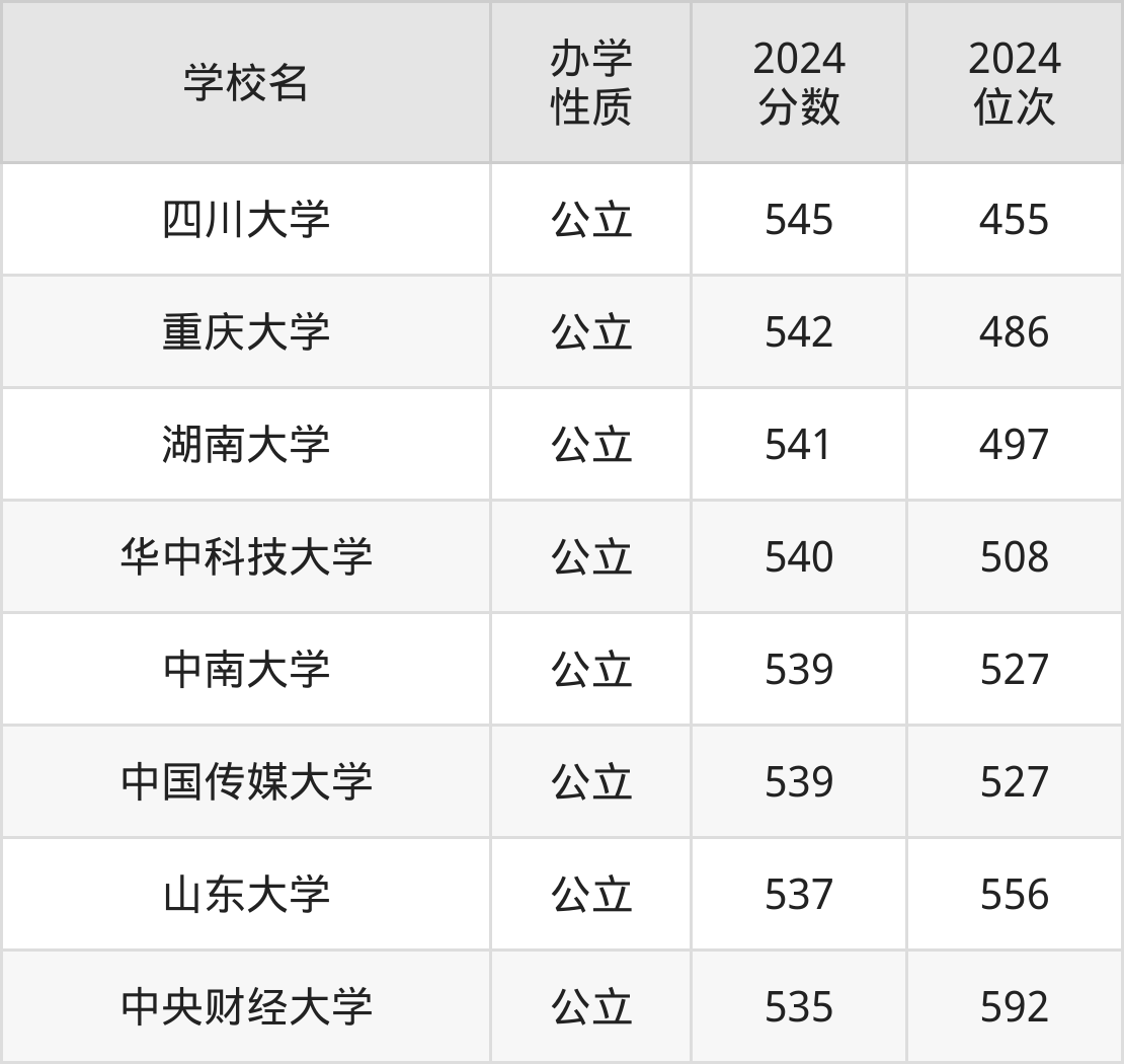 2024年新疆文科540分考生能上四川大学、重庆大学、湖南大学、华中科技大学、中南大学等8所一本院校,具体录取分数线及位次为: