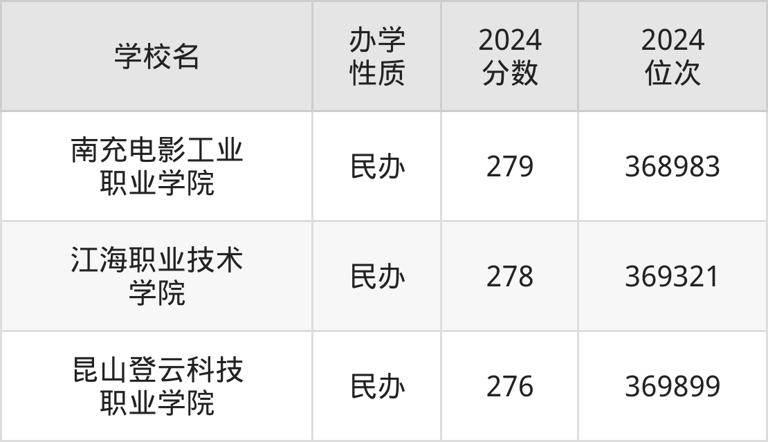 2024年河北物理类280分考生能上南充电影工业职业学院、江海职业技术学院、昆山登云科技职业学院3所专科院校,具体录取分数线及位次为: