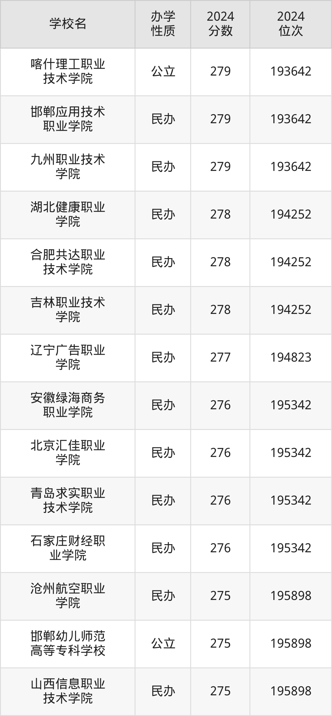| 喀什理工职业 技术学院 | 279 | 193642 |