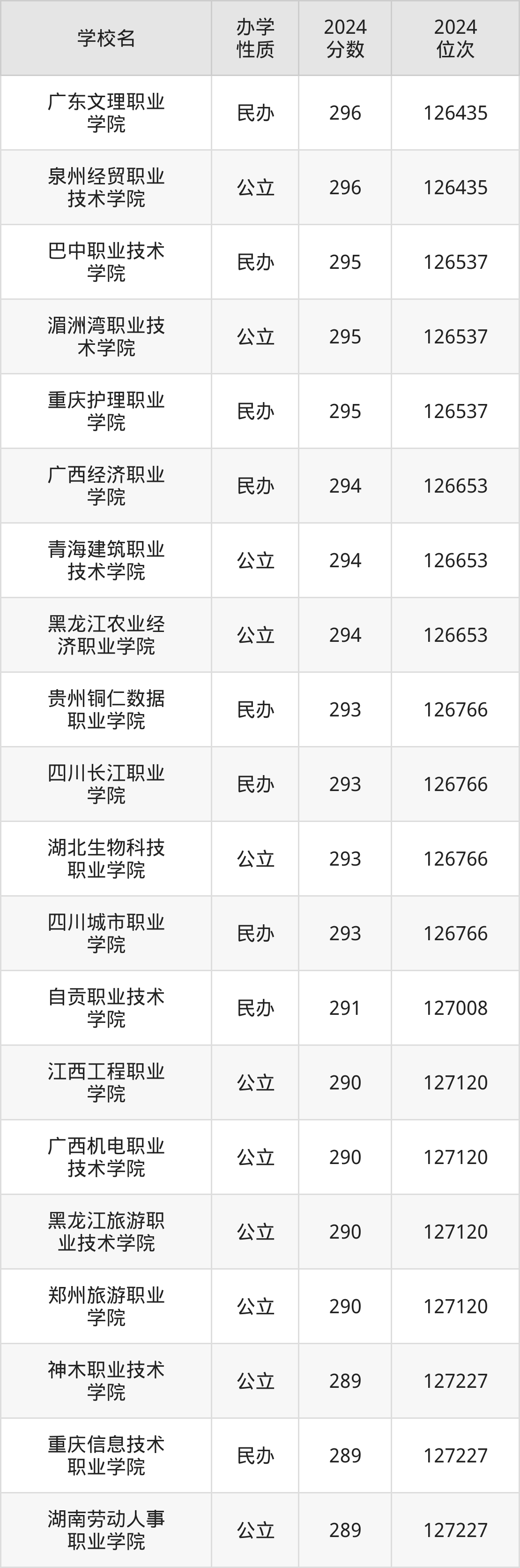 | 黑龙江旅游职 业技术学院 | 290 | 127120 |