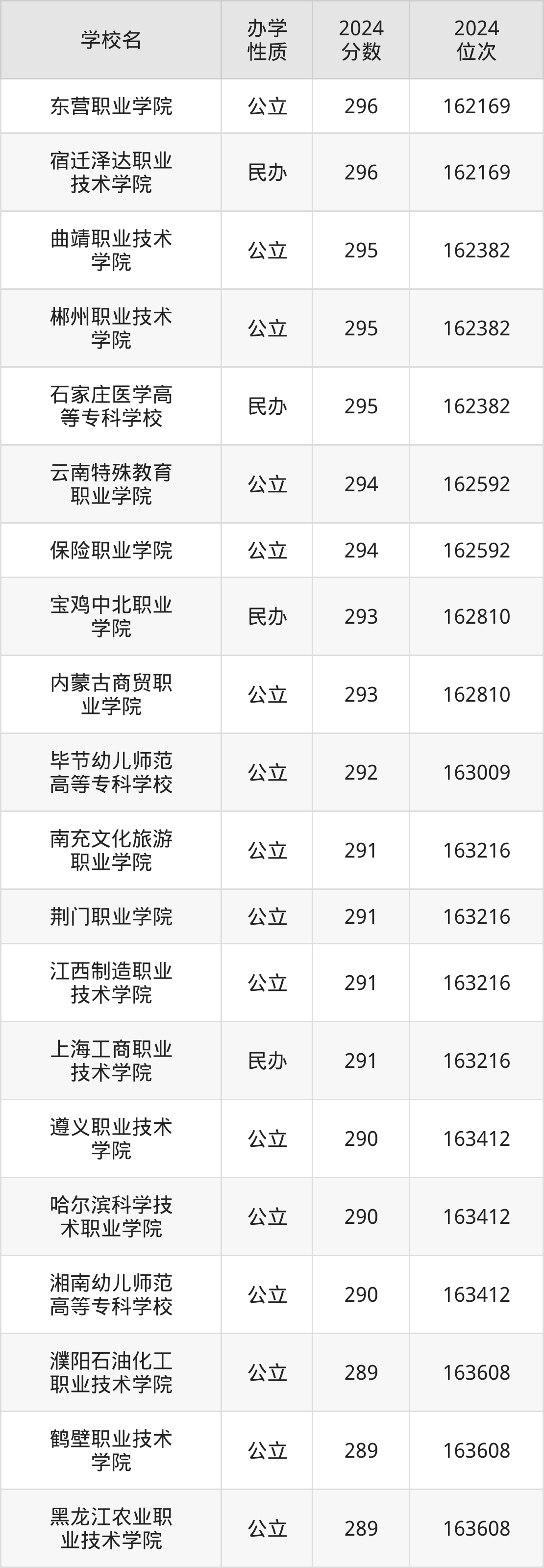 2024年云南理科291分考生能上东营职业学院、宿迁泽达职业技术学院、曲靖职业技术学院、郴州职业技术学院、石家庄医学高等专科学校等31所专科院校,具体录取分数线及位次为: