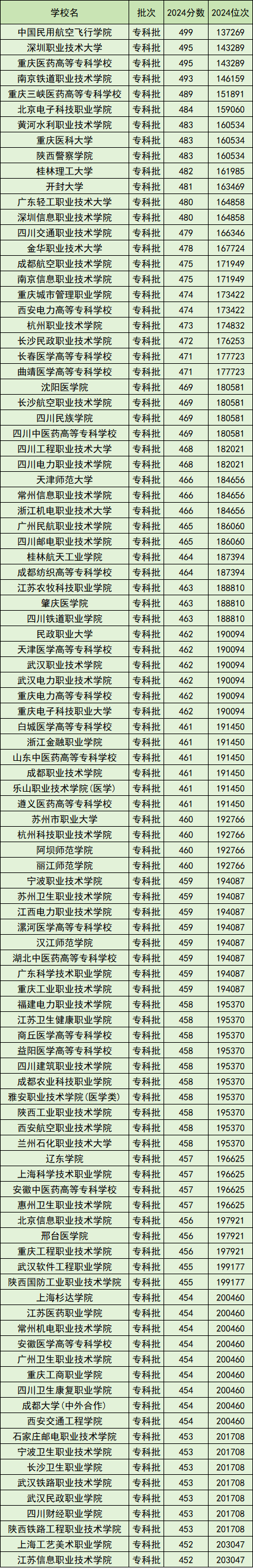 下面是2024全国专科大学在四川理科招生的前100名录取分数线一览表。