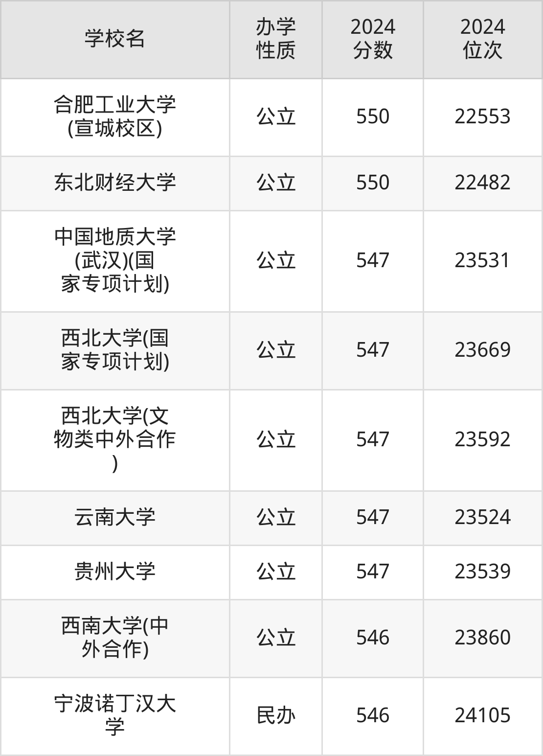 | 合肥工业大学 (宣城校区) | 550 | 22553 |
