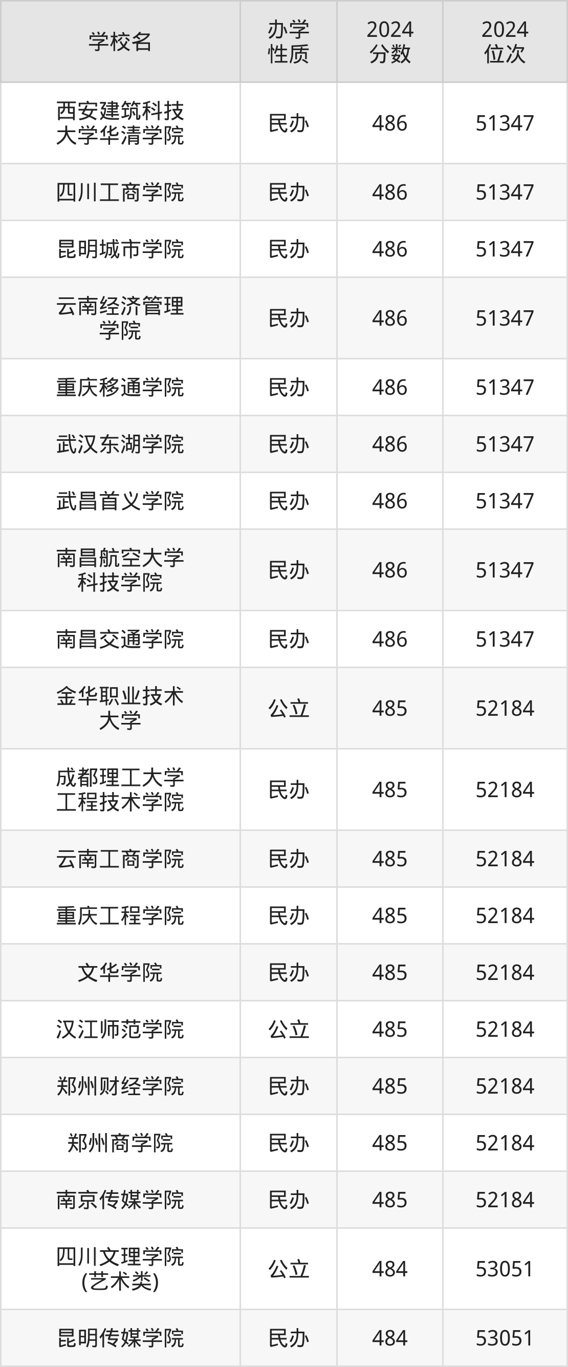 2024年四川文科481分考生能上西安建筑科技大学华清学院、四川工商学院、昆明城市学院、云南经济管理学院、重庆移通学院等100所二本院校,具体录取分数线及位次为: