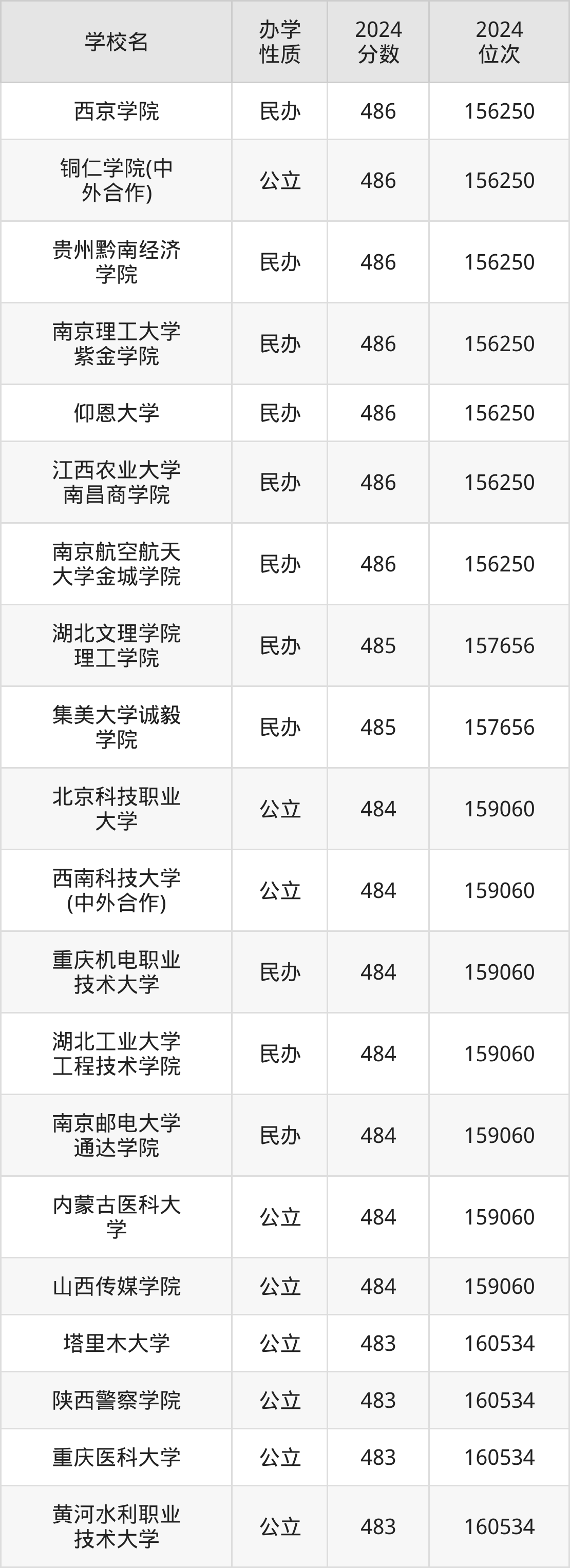2024年四川理科481分考生能上西京学院、铜仁学院(中外合作)、贵州黔南经济学院、南京理工大学紫金学院、仰恩大学等66所二本院校,具体录取分数线及位次为: