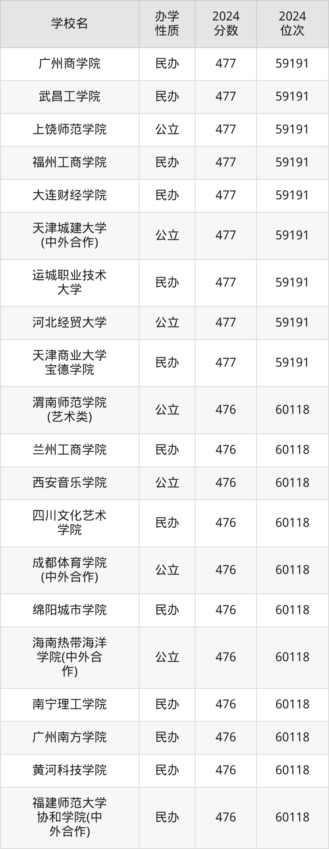 | 渭南师范学院 (艺术类) | 476 | 60118 |