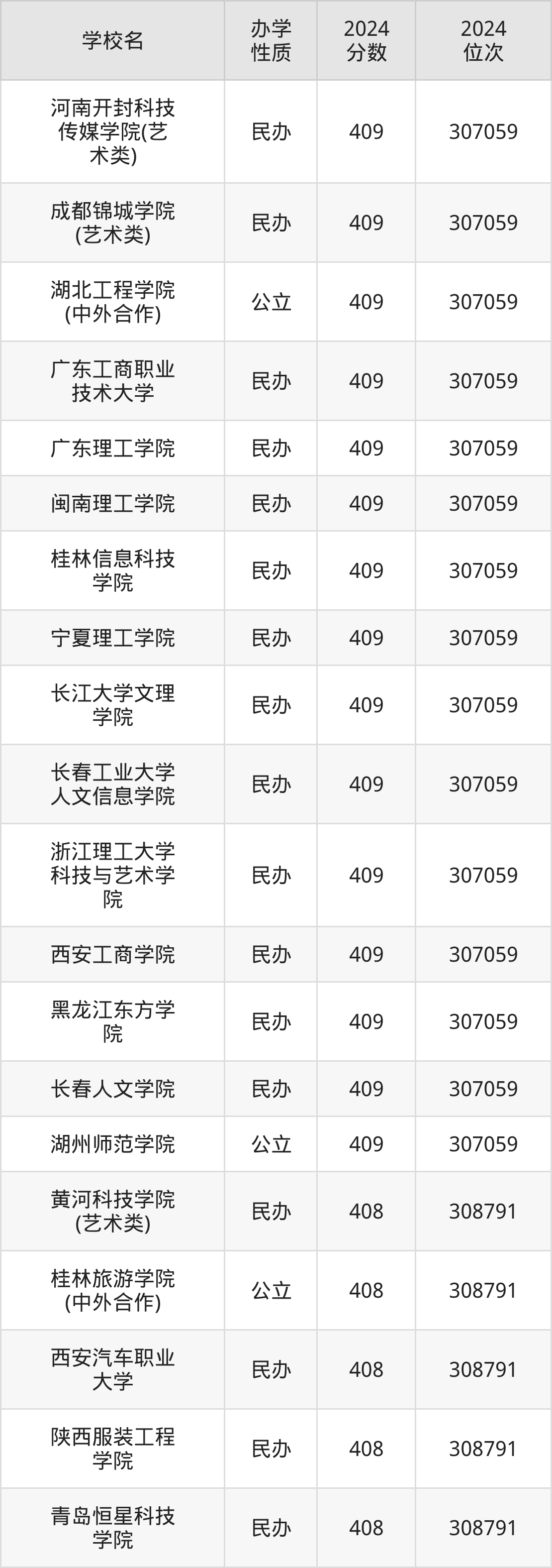 2024年河南理科404分考生能上河南开封科技传媒学院(艺术类)、成都锦城学院(艺术类)、湖北工程学院(中外合作)、广东工商职业技术大学、广东理工学院等123所二本院校,具体录取分数线及位次为: