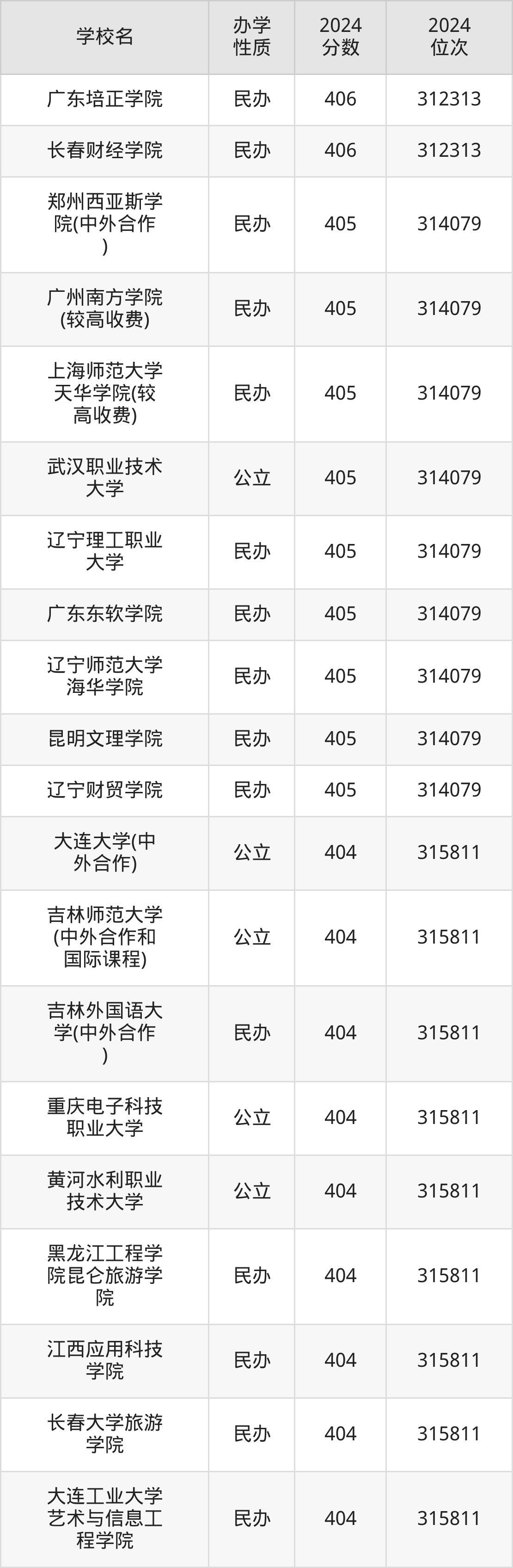 | 吉林外国语大 学(中外合作 ) | 404 | 315811 |